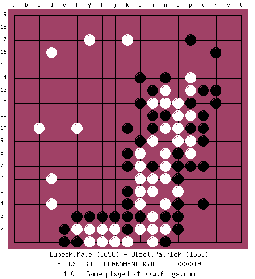 Last move : 1-0 2011 September 7 20:8:29 [Event "FICGS__GO__TOURNAMENT_KYU_III__000019"] [Site "FICGS"] [Date "2011.05.20"] [Round "1"] [Black "Lubeck,Kate"] [White "Bizet,Patrick"] [Result "1-0"] [Rating 1 "1658"] [Rating 2 "1552"] 1.r16 d16 2.q4 d4 3.p17 k17 4.f3 c10 5.k4 d6 6.q10 n4 7.o3 n6 8.p7 n8 9.k10 n10 10.l12 n12 11.m13 p11 12.q11 p13 13.r13 q12 14.r12 p9 15.q9 p8 16.q7 g17 17.o7 n7 18.o8 o9 19.m10 m9 20.l9 l8 21.k8 l7 22.k7 f10 23.m11 n13 24.n11 o11 25.p10 o10 26.q13 p14 27.p12 o12 28.n14 l5 29.k5 l4 30.l3 l6 31.m7 m6 32.n5 o5 33.o4 m3 34.n3 m12 35.l14 m5 36.o6 l2 37.k3 n2 38.o2 j2 39.k2 k1 40.j3 h2 41.h3 f2 42.e2 g2 43.n1 m2 44.f1 g1 45.j1 h1 46.e1 j1 47.l1 m1 48.g3 1-0 Here are the names of the openings (joseki) played in the four corners : Corner d4 : d4 f3 Hoshi (Hwajeom, Seongjeom, Xingwei`) 4-4 Point. The star or hoshi (4-4) point, emphasizing influence at the potential expense of territory. Ikken Kakari (Hankan Keolch'im, Yi Gua`jiao~, 1-Space Low Approach). Black 2 is the standard approach move to the 4-4. Corner q4 : q4 n4 Hoshi (Hwajeom, Seongjeom, Xingwei`) 4-4 Point. The star or hoshi (4-4) point, emphasizing influence at the potential expense of territory. Niken Takagakari (Dukan Nop'dakeolch'im, E`r Gaojia, 2-Space High Approach). White 2 is a light approach move. Rarely played in even games, White 2 is typically employed in handicap games. Black continues with 6-4 or 3-10. In Korean Sunjang Baduk Black has a stone on 8-4. Player Black won this Go (weiqi, baduk) game. Follow this game move after move (download)With only one group, you will win. (Anonymous) When you have everything, sometimes it feels like nothing. (Horatio Caine, C.S.I. Miami)