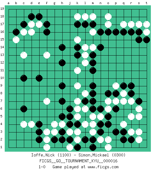 Last move : 1-0 2007 February 1 21:39:26 [Event "FICGS__GO__TOURNAMENT_KYU__000016"] [Site "FICGS"] [Date "2006.12.23"] [Round "1"] [Black "Ioffe,Nick"] [White "Simon,Mickael"] [Result "1-0"] [Rating 1 "1100"] [Rating 2 "0300"] 1.q16 d4 2.q3 d16 3.r9 o17 4.m17 r17 5.r16 q17 6.p16 s17 7.o16 o18 8.j4 g3 9.c10 c13 10.c6 c4 11.e10 r5 12.o4 r3 13.r2 q4 14.p3 s3 15.p6 m3 16.h3 g4 17.s7 s2 18.q2 s5 19.s16 m5 20.m7 l6 21.j6 k7 22.h7 k9 23.m9 k11 24.m11 r7 25.r8 q7 26.n6 p9 27.p8 s6 28.k13 o2 29.n4 m4 30.f17 e17 31.f16 f13 32.h12 l12 33.m12 l13 34.m13 m14 35.k14 l14 36.n14 k15 37.h14 m16 38.n16 f7 39.h9 k2 40.g2 t16 41.t15 f2 42.j2 t17 43.s15 k3 44.n3 n2 45.k4 l4 46.l2 l1 47.m2 j1 48.h2 o1 49.m1 l8 50.l7 k6 51.h5 k5 52.m6 q8 53.q9 p7 54.o8 o7 55.m8 n5 56.o5 o6 57.c17 c16 58.b16 b15 59.e18 d17 60.d18 m18 61.l17 l18 62.k17 k18 63.e2 f1 64.e3 f3 65.e4 h4 66.j5 j3 67.k1 1-0 Here are the names of the openings (joseki) played in the four corners : Corner q16 : q16 o17 Hoshi (Hwajeom, Seongjeom, Xingwei`) 4-4 Point. The star or hoshi (4-4) point, emphasizing influence at the potential expense of territory. Ikken Kakari (Hankan Keolch'im, Yi Gua`jiao~, 1-Space Low Approach). White 2 is the standard approach move to the 4-4. Corner d4 : d4 j4 Hoshi (Hwajeom, Seongjeom, Xingwei`) 4-4 Point. The star or hoshi (4-4) point, emphasizing influence at the potential expense of territory. Player Black won this Go (weiqi, baduk) game. Follow this game move after move (download)Don't count territory held by only one eye. (Anonymous) Over-the-board chess is the favorite of mortals, correspondence chess is the favorite of the gods. (Eduard Dyckhoff)