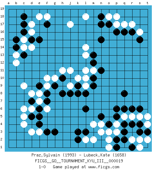 Last move : 1-0 2011 August 2 18:32:31 [Event "FICGS__GO__TOURNAMENT_KYU_III__000019"] [Site "FICGS"] [Date "2011.05.20"] [Round "1"] [Black "Praz,Sylvain"] [White "Lubeck,Kate"] [Result "1-0"] [Rating 1 "1993"] [Rating 2 "1658"] 1.r16 d16 2.q3 d3 3.p16 c9 4.g3 r5 5.q8 p4 6.q4 q5 7.p5 p3 8.p2 o2 9.q2 n3 10.r4 s5 11.s4 s2 12.p6 t4 13.t3 t5 14.s3 r2 15.r1 s1 16.r6 q1 17.p1 t2 18.s6 o1 19.r1 q17 20.o4 o3 21.q6 r17 22.q16 s16 23.s15 p17 24.o17 o18 25.n17 j17 26.k3 l2 27.l3 m2 28.k2 n4 29.n5 m4 30.l6 j11 31.d5 c4 32.e4 c5 33.c17 d17 34.c16 c15 35.b15 c14 36.b14 b13 37.c13 b12 38.d15 d14 39.e15 e18 40.c18 l18 41.n18 p18 42.f17 f18 43.n15 l14 44.m13 l13 45.m12 d6 46.e6 e7 47.d7 c6 48.f7 e8 49.f8 f6 50.e5 f9 51.e9 d8 52.g9 f10 53.h8 g10 54.h10 h11 55.k9 l11 56.m10 m11 57.n11 l10 58.m9 l9 59.l8 j9 60.j8 k10 61.k8 e3 62.f3 1-0 Here are the names of the openings (joseki) played in the four corners : Corner q4 : q3 r5 Komoku (Somok, Xiao~mu`) 3-4 Point. The komoku (3-4) point is the traditional corner enclosure move.. Ikken Kakari (Hankan Keolch'im, Yi Gua`jiao~, 1-Space Low Pincer). The small knight move is the basic approach move to the 3-4 point stone. It has been continually used for over four centuries. There are limitless variations, with new moves constantly being discovered. White 2 opens the door to a treaure store of joseki. Player Black won this Go (weiqi, baduk) game. Follow this game move after move (download)The L-group is dead. (Anonymous) I've never seen so many men wasted so badly. (Blondie in The Good, The Bad and The Ugly)
