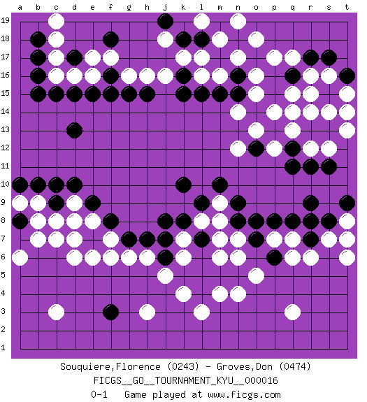Last move : 0-1 2007 March 26 0:56:32 [Event "FICGS__GO__TOURNAMENT_KYU__000016"] [Site "FICGS"] [Date "2006.12.23"] [Round "1"] [Black "Souquiere,Florence"] [White "Groves,Don"] [Result "0-1"] [Rating 1 "0243"] [Rating 2 "0474"] 1.d17 q3 2.q16 c3 3.c10 d6 4.r13 r6 5.r9 k4 6.k10 k7 7.k8 l8 8.l7 m8 9.m7 n7 10.l9 m6 11.l6 k6 12.l5 m4 13.m5 n6 14.l4 l3 15.n8 m9 16.k5 j5 17.n5 n4 18.j7 o5 19.m10 k17 20.k16 l16 21.l15 j16 22.k15 f17 23.j6 h6 24.j8 f6 25.d13 c8 26.f16 g16 27.h7 g6 28.n9 e16 29.g7 d16 30.f15 m16 31.m15 p17 32.o7 q17 33.d8 d7 34.r7 q7 35.q8 s7 36.r8 p7 37.o8 r16 38.n16 n17 39.g15 h16 40.h15 o16 41.n15 o15 42.o14 q15 43.p8 q13 44.q12 r14 45.p13 q14 46.e7 e6 47.b15 c16 48.t7 t8 49.b8 b7 50.c9 c7 51.t9 t6 52.s8 t7 53.b16 c17 54.a7 a6 55.b17 c18 56.c15 f7 57.f8 e8 58.e9 d9 59.d10 d8 60.s13 s14 61.t14 t15 62.f18 e17 63.s15 t13 64.t16 t14 65.m17 l17 66.a8 b9 67.b18 c19 68.b10 a9 69.a10 p14 70.a8 b8 71.r17 s16 72.p6 q6 73.n18 m18 74.m19 o18 75.s17 r15 76.l18 n19 77.d15 s12 78.s11 r12 79.r11 p12 80.o12 o13 81.f3 h3 82.l7 m7 83.k18 j18 84.j19 l19 85.q11 n14 86.e15 n12 0-1 Here are the names of the openings (joseki) played in the four corners : Corner d16 : d17 j16 Komoku (Somok, Xiao~mu`) 3-4 Point. The komoku (3-4) point is the traditional corner enclosure move.. Player White won this Go (weiqi, baduk) game. Follow this game move after move (download)The monkey jump is worth eight points. (Anonymous) Happy endings are just stories that haven't finished yet. (Jane Smith in Mr & Mrs Smith)