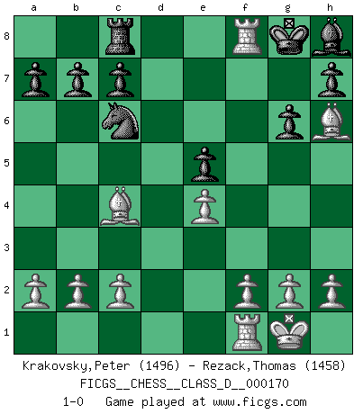 Last move : 1-0 2011 July 22 19:59:2 [Event "FICGS__CHESS__CLASS_D__000170"] [Site "FICGS"] [Date "2011.05.21"] [Round "1"] [White "Krakovsky,Peter"] [Black "Rezack,Thomas"] [Result "1-0"] [WhiteElo "1496"] [BlackElo "1458"] 1.e4 d6 2.d4 g6 3.Nf3 Bg7 4.Nc3 Bd7 5.Bc4 Nc6 6.O-O e6 7.Be3 Nge7 8.Qd2 O-O 9.Bh6 e5 10.dxe5 Nxe5 11.Nxe5 dxe5 12.Rad1 Nc6 13.Bg5 Qc8 14.Qxd7 Qxd7 15.Rxd7 Rac8 16.Nd5 f6 17.Bh6 Rf7 18.Nxf6+ Bxf6 19.Rxf7 Bh8 20.Rf8+ 1-0 King's pawn Opening Kingside Castling by player White (move 6) Kingside Castling by player Black (move 8) Player White won this chess game. Follow this game move after move (download)Chess is a sea in which a gnat may drink and an elephant may bathe. (Hindu proverb) Sicherlich können nur Meister einen Stil haben. Daß ein nicht-Meister auch nur ein einziges Mal in seinem Leben eine Partie folgerecht durchführte, habe ich niemals bemerkt. (Emanuel Lasker) Personalmente, yo prefiero mirar hacia el futuro en donde un programa de computadora gane el título mundial de Ajedrez. La humanidad necesita una lección de humildad. (Richard Dawkings) Je ne crois pas en la psychologie, je crois aux bons coups. (Robert Fischer) He who is a good ruler must first have been ruled. (Aristotle)