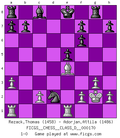 Last move : 1-0 2011 September 8 22:2:9 [Event "FICGS__CHESS__CLASS_D__000170"] [Site "FICGS"] [Date "2011.05.21"] [Round "1"] [White "Rezack,Thomas"] [Black "Adorjan,Attila"] [Result "1-0"] [WhiteElo "1458"] [BlackElo "1486"] 1.e4 c5 2.Nf3 Nc6 3.d4 cxd4 4.Nxd4 Nf6 5.Nc3 e5 6.Nf3 Bb4 7.Bg5 Bxc3+ 8.bxc3 Qa5 9.Bxf6 Qxc3+ 10.Nd2 gxf6 11.a3 Rg8 12.g3 Nd4 13.Bd3 d5 14.O-O Qxd2 15.Qxd2 Nf3+ 16.Kg2 Nxd2 17.Rfe1 dxe4 18.Bxe4 1-0 This chess game has been lost on time (started : 2011.05.21 11:17:55) Sicilian : Pelikan (Lasker/Sveshnikov) variation Kingside Castling by player White (move 14) Player White won this chess game. Follow this game move after move (download)I have never in my life played the French Defence, which is the dullest of all openings. (Wilhelm Steinitz) Gott hat gewollt, dass ich Champion werde. (Surab Azmajparaschvili) Aquellos que dicen entender al Ajedrez, no entienden nada. (Robert Hubner) J'ai vu le vaincu d'Echecs jouer des années durant dans l'espoir de la fête de la victoire. Car tu es plus riche de ce qu'elle existe si même elle n'est point pour toi. Ainsi de la perle du fond des mers. (Antoine de Saint-Exupéry) Don't anthropomorphize computers - they hate it. (Anonymous)
