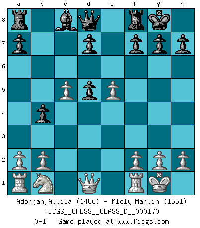 Last move : 0-1 2011 September 19 10:33:21 [Event "FICGS__CHESS__CLASS_D__000170"] [Site "FICGS"] [Date "2011.05.21"] [Round "1"] [White "Adorjan,Attila"] [Black "Kiely,Martin"] [Result "0-1"] [WhiteElo "1486"] [BlackElo "1551"] 1.e4 e5 2.Nf3 Nc6 3.d4 exd4 4.Nxd4 Nf6 5.Nxc6 bxc6 6.e5 Nd5 7.c4 Nb6 8.Bd3 Bb4+ 9.Bd2 c5 10.O-O O-O 11.Bxb4 cxb4 12.c5 Nd5 13.Be4 c6 14.Bxd5 cxd5 0-1 This chess game has been lost on time (started : 2011.05.21 11:17:55) Scotch : Mieses variation Kingside Castling by player White (move 10) Kingside Castling by player Black (move 10) Player Black won this chess game. Follow this game move after move (download)The passed pawn is a criminal, who should be kept under lock and key. Mild measures, such as police surveillance, are not sufficient. (Nimzovitch) Ich habe kein Problem mit Frauen, sondern nur mit dem Niveau ihres Schachspiels (Judith Polgar) Con o sin el título, Bobby Fischer fue sin lugar a dudas el mas grande jugador de su época. (Burt Hochberg) Mon pion favori sur ma case favorite ! Bronstein en parlant d'un coup de pion en h5 quand il avait les Noirs. Perseverance does not equal worthiness. Next time you want to get my attention, wear something fun. Low-riding jeans are hot. (Gregory House, House M.D.)
