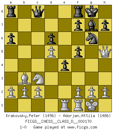 Last move : 1-0 2011 October 9 23:43:36 [Event "FICGS__CHESS__CLASS_D__000170"] [Site "FICGS"] [Date "2011.05.21"] [Round "1"] [White "Krakovsky,Peter"] [Black "Adorjan,Attila"] [Result "1-0"] [WhiteElo "1496"] [BlackElo "1486"] 1.e4 c5 2.Nf3 Nc6 3.d4 cxd4 4.Nxd4 Nf6 5.Nc3 e5 6.Ndb5 d6 7.Bg5 a6 8.Na3 b5 9.Bxf6 gxf6 10.Nd5 f5 11.Bd3 Be6 12.O-O Bxd5 13.exd5 Ne7 14.Nxb5 Bg7 15.Nc3 e4 16.Bc4 Ng6 17.Qh5 Qc8 18.Bb3 O-O 19.Rae1 1-0 This chess game has been lost on time (started : 2011.05.21 11:17:55) Sicilian : Pelikan (Lasker/Sveshnikov) variation Kingside Castling by player White (move 12) Kingside Castling by player Black (move 18) Player White won this chess game. Follow this game move after move (download)A thorough understanding of the typical mating continuations makes the most complicated sacrificial combinations leading up to them not only not difficult, but almost a matter of course. (Siegbert Tarrasch) Zum Sieg gelangt man nicht, wenn man gut, sondern nur wenn man besser spielt (Savielly Grigorievitsch Tartakower) El Ajedrez, como cualquier otra actividad creativa, puede existir solo a través de méritos combinados de aquellos que tienen talento creativo y de aquellos que tienen la habilidad de organizar un trabajo creativo. (Mikhail Botvinnik) Votre seul travail dans les ouvertures est d'obtenir un milieu de partie jouable. (Lajos Portish) When you stop learning you start dying. (M. Scott Adams)