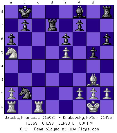 Last move : 0-1 2011 July 18 23:13:45 [Event "FICGS__CHESS__CLASS_D__000170"] [Site "FICGS"] [Date "2011.05.21"] [Round "1"] [White "Jacobs,Francois"] [Black "Krakovsky,Peter"] [Result "0-1"] [WhiteElo "1502"] [BlackElo "1496"] 1.e4 c5 2.c3 Nf6 3.e5 Nd5 4.d4 cxd4 5.Nf3 Nc6 6.cxd4 d6 7.Bc4 dxe5 8.dxe5 Ndb4 9.Qb3 e6 10.O-O Na5 11.Bb5+ Bd7 12.Qa4 Bxb5 13.Qxb5+ Nac6 14.Nc3 a6 15.Qe2 Qd3 16.Bg5 h6 17.Bf4 g5 18.Bg3 Qxe2 19.Nxe2 Nd3 20.Ned4 Nxd4 21.Nxd4 O-O-O 22.Nb3 Rd7 23.Na5 Nxb2 24.Rfc1+ Kb8 0-1 Sicilian : Alapin's variation (2.c3) Kingside Castling by player White (move 10) Queenside Castling by player Black (move 21) Player Black won this chess game. Follow this game move after move (download)Different people feel differently about resigning. (Bobby Fischer) Wie, soll nun auch die Opposition abgeschafft werden? Ja, es tut mir leid, Ihnen diesen Schmerz nicht ersparen zu können. (Aaron Nimzowitsch) El hombre es un frívolo, una creatura engañosa y como un jugador de Ajedrez, se preocupa mas por el proceso de obtener su meta que de la meta por sí misma. (Dostoyevsky) Le moment que je préfère le plus dans une rencontre, c'est celui où je sens que la personnalité de l'adversaire se brise. (Robert Fischer) Whoever said the pen is mightier than the sword obviously never encountered automatic weapons. (US General Douglas MacArthur)