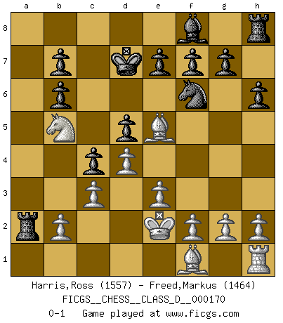 Last move : 0-1 2011 June 16 10:20:48 [Event "FICGS__CHESS__CLASS_D__000170"] [Site "FICGS"] [Date "2011.05.21"] [Round "1"] [White "Harris,Ross"] [Black "Freed,Markus"] [Result "0-1"] [WhiteElo "1557"] [BlackElo "1464"] 1.d4 d5 2.Nf3 Nf6 3.Bf4 c5 4.e3 Nc6 5.c3 Qb6 6.Qb3 c4 7.Qxb6 axb6 8.Na3 Bf5 9.Nb5 Ra5 10.a4 Bc2 11.Nc7+ Kd7 12.Ng5 Nd8 13.Nb5 Bxa4 14.Bc7 h6 15.Rxa4 Rxa4 16.Nf3 Ra1+ 17.Ke2 Nc6 18.Ne5+ Nxe5 19.Bxe5 Ra2 0-1 Queen's Bishop game Player Black won this chess game. Follow this game move after move (download)The most important feature of the Chess position is the activity of the pieces. This is absolutely fundamental in all phases of the game: Opening, Middlegame and especially Endgame. The primary constraint on a piece's activity is the Pawn structure. (Michael Stean) Die Idee von Capablanca, Schach als Fach in den Schulen zu lehren, ist großartig. (Fidel Castro) Debemos de asegurarnos de que el Ajedrez no se convierta en un lenguaje muerto, muy interesante, pero solo para un grupo muy pequeño. (Sytze Faber) Les échecs c'est le défi de l'alpiniste, toujours plus haut, prêt à tout pour monter à l'assaut du Roi ennemi. Les échecs, c'est de la musique en mouvement, un ballet majestueux pour les yeux. C'est de la poésie composée par les fantômes du passé qui au même titre que Rimbaud ou Verlaine méritent notre admiration. Les échecs, c'est de la peinture ou le moindre mouvement modifie le tableau pour en faire un Picasso ou un Van Gogh. Les échecs, c'est tout et rien, c'est la vie et la mort. Jjulie33 sur le forum de France-Echecs. Computers are like Old Testament gods; lots of rules and no mercy. (Joseph Campbell)