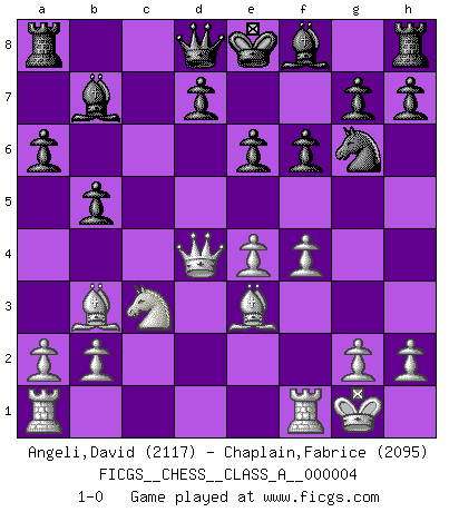Last move : 1-0 2006 September 20 8:3:12 [Event "FICGS__CHESS__CLASS_A__000004"] [Site "FICGS"] [Date "2006.05.04"] [Round "1"] [White "Angeli,David"] [Black "Chaplain,Fabrice"] [Result "1-0"] [WhiteElo "2117"] [BlackElo "2095"] 1.e4 c5 2.d4 cxd4 3.c3 dxc3 4.Nxc3 Nc6 5.Nf3 e6 6.Bc4 a6 7.O-O Nge7 8.Bg5 f6 9.Be3 Ng6 10.Nd4 Nxd4 11.Qxd4 b5 12.Bb3 Bb7 13.f4 1-0 Sicilian : Smith-Morra gambit Kingside Castling by player White (move 7) Player White won this chess game. Follow this game move after move (download)It began to feel as though you were playing against Chess itself. - On playing against Robert Fischer. (Walter Shipman) Das Zentrum ist der Balkan des Schachbretts - Kriegshandlungen können in jedem Moment ausbrechen. (Aaron Nimzowitsch) Las combinaciones han sido siempre el aspecto más intrigante del Ajedrez. Los Maestros las buscan, el público las aplauden, los críticos las alaban. La razón se debe a que las combinaciones hacen posible que el Ajedrez sea más que un ejercicio matemático con una carencia de vida. Ellas son la poesía del juego, son del Ajedrez lo que la melodía es de la música. Ellas representan el triunfo de la mente sobre la materia. (Reuben Fine) Le moment que je préfère le plus dans une rencontre, c'est celui où je sens que la personnalité de l'adversaire se brise. (Robert Fischer) It's not the size of the dog in the fight, it's the size of the fight in the dog. (Mark Twain)