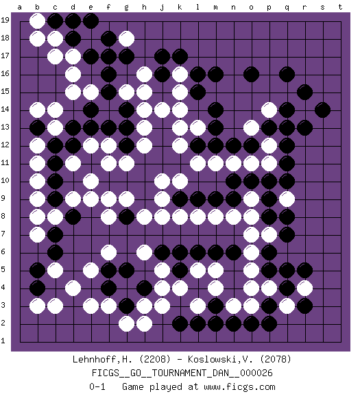 Last move : 0-1 2012 April 10 17:19:48 [Event "FICGS__GO__TOURNAMENT_DAN__000026"] [Site "FICGS"] [Date "2011.05.22"] [Round "1"] [Black "Lehnhoff,Heinz-Georg"] [White "Koslowski,Volker"] [Result "0-1"] [Rating 1 "2208"] [Rating 2 "2078"] 1.q16 d4 2.q4 d16 3.f17 c14 4.d18 c17 5.j17 r14 6.o16 k8 7.c6 p7 8.r15 e9 9.q14 p4 10.p3 o3 11.p5 o4 12.p2 r4 13.r5 q3 14.q5 o5 15.r3 p11 16.o2 k14 17.m3 j4 18.m6 m5 19.n6 o6 20.b4 q13 21.f4 e5 22.f5 f6 23.r13 p14 24.s14 f3 25.g3 g4 26.g5 e3 27.l6 l5 28.k6 j5 29.j6 h6 30.k5 k4 31.n9 o9 32.o10 n8 33.m9 m8 34.l9 l8 35.n12 o11 36.p10 n11 37.m12 m11 38.l12 l11 39.k11 k12 40.j12 k13 41.j11 k10 42.m14 h13 43.k9 j9 44.g12 h12 45.h11 g11 46.j13 j14 47.g10 f11 48.h10 h15 49.g8 g9 50.h9 j8 51.m16 f8 52.f10 e10 53.f15 f9 54.k2 f14 55.p13 g2 56.q11 q9 57.q10 o13 58.q12 c5 59.b5 g18 60.g17 e18 61.e17 b7 62.h4 h2 63.p9 o8 64.n10 c3 65.c7 b8 66.c9 c8 67.d8 b9 68.c10 b10 69.c12 b11 70.c11 b12 71.e11 f12 72.g13 h14 73.f13 e12 74.e14 h8 75.d13 d17 76.f18 e15 77.g14 c18 78.e19 d9 79.q8 l3 80.b13 b14 81.e13 d11 82.l2 n3 83.n2 m4 84.m2 c13 85.d12 j10 86.o12 b3 87.q7 p12 88.q13 d15 89.c19 g15 90.f16 b19 91.d19 k16 92.k17 j3 93.l16 b18 94.j16 k15 95.p6 h3 96.p8 o7 97.l15 l13 98.m13 h16 0-1 Here are the names of the openings (joseki) played in the four corners : Corner d16 : d16 f17 Hoshi (Hwajeom, Seongjeom, Xingwei`) 4-4 Point. The star or hoshi (4-4) point, emphasizing influence at the potential expense of territory. Ikken Kakari (Hankan Keolch'im, Yi Gua`jiao~, 1-Space Low Approach). Black 2 is the standard approach move to the 4-4. Corner q16 : q16 r14 Hoshi (Hwajeom, Seongjeom, Xingwei`) 4-4 Point. The star or hoshi (4-4) point, emphasizing influence at the potential expense of territory. Ikken Kakari (Hankan Keolch'im, Yi Gua`jiao~, 1-Space Low Approach). White 2 is the standard approach move to the 4-4. Corner d4 : d4 c6 Hoshi (Hwajeom, Seongjeom, Xingwei`) 4-4 Point. The star or hoshi (4-4) point, emphasizing influence at the potential expense of territory. Ikken Kakari (Hankan Keolch'im, Yi Gua`jiao~, 1-Space Low Approach). Black 2 is the standard approach move to the 4-4. Corner q4 : q4 p7 Hoshi (Hwajeom, Seongjeom, Xingwei`) 4-4 Point. The star or hoshi (4-4) point, emphasizing influence at the potential expense of territory. Player White won this Go (weiqi, baduk) game. Follow this game move after move (download)The carpenter's square becomes ko. (Anonymous) Secret operations are essential in war; upon them the army relies to make its every move. (Sun Tzu)