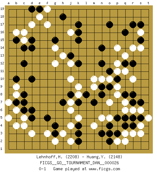 Last move : 0-1 2012 January 12 0:35:46 [Event "FICGS__GO__TOURNAMENT_DAN__000026"] [Site "FICGS"] [Date "2011.05.22"] [Round "1"] [Black "Lehnhoff,Heinz-Georg"] [White "Huang,Yen-Wei"] [Result "0-1"] [Rating 1 "2208"] [Rating 2 "2148"] 1.q16 d17 2.q4 d3 3.d15 c15 4.c14 c16 5.d5 c5 6.c6 c4 7.d6 f3 8.d14 f17 9.d10 r10 10.r8 r14 11.r12 p14 12.o17 s16 13.r17 q11 14.q12 p12 15.s17 q13 16.n3 r3 17.r4 q3 18.p3 p2 19.o2 p4 20.o3 s4 21.s5 s3 22.p5 q2 23.o9 j4 24.b15 b16 25.b5 b4 26.f5 g14 27.g3 h3 28.g4 g2 29.k17 j6 30.o11 p11 31.p10 n10 32.n9 m10 33.k15 m9 34.s15 s14 35.k12 j16 36.k16 g12 37.c12 b6 38.b7 a5 39.h18 b8 40.c8 a7 41.c7 b9 42.b10 s6 43.r5 t5 44.s7 r6 45.q5 q7 46.q8 o7 47.n8 p8 48.r7 q6 49.m7 o5 50.o4 n5 51.k3 j2 52.k2 m4 53.l8 o10 54.n12 p9 55.e19 e18 56.k4 k5 57.g15 j10 58.j8 k9 59.d19 f19 60.h7 j12 61.n14 k8 62.k7 j7 63.j13 h13 0-1 Here are the names of the openings (joseki) played in the four corners : Corner d16 : d17 d15 Komoku (Somok, Xiao~mu`) 3-4 Point. The komoku (3-4) point is the traditional corner enclosure move.. Ikken Takagakari (Hankan Nop'dakeolch'im, Yi Gaogua`jiao~, 1-Space High Approach). The 5-4 approach move has become more popular in modern times, as modern Go emphasizes speed and influence. Corner d4 : d3 d5 Komoku (Somok, Xiao~mu`) 3-4 Point. The komoku (3-4) point is the traditional corner enclosure move.. Ikken Takagakari (Hankan Nop'dakeolch'im, Yi Gaogua`jiao~, 1-Space High Approach). The 5-4 approach move has become more popular in modern times, as modern Go emphasizes speed and influence. Corner q16 : q16 r14 Hoshi (Hwajeom, Seongjeom, Xingwei`) 4-4 Point. The star or hoshi (4-4) point, emphasizing influence at the potential expense of territory. Ikken Kakari (Hankan Keolch'im, Yi Gua`jiao~, 1-Space Low Approach). White 2 is the standard approach move to the 4-4. Player White won this Go (weiqi, baduk) game. Follow this game move after move (download)Every move brings change. (Pierre Audouard) May I never be complete. May I never be content. May I never be perfect. Deliver me, Tyler, from being perfect and complete. (Chuck Palahniuk, Fight Club)