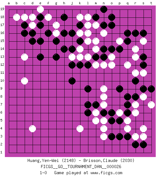 Last move : 1-0 2011 October 25 20:23:7 [Event "FICGS__GO__TOURNAMENT_DAN__000026"] [Site "FICGS"] [Date "2011.05.22"] [Round "1"] [Black "Huang,Yen-Wei"] [White "Brisson,Claude"] [Result "1-0"] [Rating 1 "2148"] [Rating 2 "2030"] 1.q16 d4 2.q3 d17 3.d15 c13 4.c17 c18 5.c16 g17 6.e13 c10 7.e18 d18 8.e17 e16 9.d16 e19 10.f16 f18 11.e15 q5 12.k17 b18 13.q8 n4 14.p5 p6 15.o5 r3 16.o3 q4 17.p3 n3 18.r2 s4 19.s2 n5 20.q6 r6 21.q7 r7 22.r8 s8 23.s9 t7 24.n6 r14 25.r16 s11 26.t9 s3 27.r10 s15 28.s16 n16 29.p14 q12 30.s13 r13 31.s12 o12 32.n13 n12 33.m13 n9 34.h18 g16 35.g13 k16 36.j16 j15 37.h16 h15 38.g15 l17 39.k15 l16 40.j14 m6 41.m7 n7 42.o6 n8 43.l6 m5 44.l7 k4 45.l9 r11 46.p9 m12 47.j10 l13 48.l14 o13 49.o14 m14 50.n14 m15 51.l12 k13 52.k12 j13 53.j12 l15 54.h14 k14 55.o17 k18 56.m18 n18 57.n17 m17 58.o18 l18 59.n19 p15 60.q15 1-0 Here are the names of the openings (joseki) played in the four corners : Corner d16 : d17 d15 Komoku (Somok, Xiao~mu`) 3-4 Point. The komoku (3-4) point is the traditional corner enclosure move.. Ikken Takagakari (Hankan Nop'dakeolch'im, Yi Gaogua`jiao~, 1-Space High Approach). The 5-4 approach move has become more popular in modern times, as modern Go emphasizes speed and influence. Corner q4 : q3 q5 Komoku (Somok, Xiao~mu`) 3-4 Point. The komoku (3-4) point is the traditional corner enclosure move.. Ikken Takagakari (Hankan Nop'dakeolch'im, Yi Gaogua`jiao~, 1-Space High Approach). The 5-4 approach move has become more popular in modern times, as modern Go emphasizes speed and influence. Corner q16 : q16 r14 Hoshi (Hwajeom, Seongjeom, Xingwei`) 4-4 Point. The star or hoshi (4-4) point, emphasizing influence at the potential expense of territory. Ikken Kakari (Hankan Keolch'im, Yi Gua`jiao~, 1-Space Low Approach). White 2 is the standard approach move to the 4-4. Player Black won this Go (weiqi, baduk) game. Follow this game move after move (download)If there is no stone on the handicap point, the carpenter's square is dead. (Anonymous) Always be a first-rate version of yourself, instead of a second-rate version of somebody else. (Judy Garland)