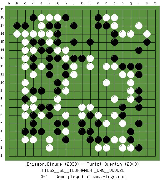 Last move : 0-1 2011 October 20 11:49:37 [Event "FICGS__GO__TOURNAMENT_DAN__000026"] [Site "FICGS"] [Date "2011.05.22"] [Round "1"] [Black "Brisson,Claude"] [White "Turlot,Quentin"] [Result "0-1"] [Rating 1 "2030"] [Rating 2 "2303"] 1.d4 q16 2.r14 o17 3.q3 d16 4.r7 c10 5.k4 f3 6.h3 c3 7.c4 d3 8.e4 f2 9.g5 d14 10.j17 e17 11.m17 s16 12.s15 r17 13.q12 p5 14.r5 p3 15.n3 q2 16.q4 o3 17.r2 n2 18.m3 m2 19.l3 n5 20.d12 c12 21.d13 c13 22.e14 d11 23.d15 c14 24.e15 c15 25.f17 f18 26.g17 q8 27.r8 q10 28.r9 q11 29.r12 q9 30.p6 o6 31.p7 o8 32.r11 n10 33.c8 e6 34.f7 d8 35.e7 d7 36.d6 c6 37.d5 c7 38.f12 g18 39.h18 e16 40.g15 f16 41.g16 f15 42.f14 g14 43.g13 h14 44.j15 e12 45.f13 h13 46.h12 j12 47.h11 j11 48.f11 h10 49.g10 h9 50.g9 g8 51.e9 k6 52.j13 l12 53.k13 g7 54.f6 h4 55.g4 h6 56.h5 n18 57.m18 p2 58.d18 e18 59.c17 c16 60.b17 b16 61.n17 o18 62.o16 p16 63.o15 l13 64.l15 o12 65.l6 l5 66.k5 k7 67.m5 m6 68.l4 l7 69.p12 p11 70.o13 n12 71.d9 c9 0-1 Here are the names of the openings (joseki) played in the four corners : Corner q16 : q16 r14 Hoshi (Hwajeom, Seongjeom, Xingwei`) 4-4 Point. The star or hoshi (4-4) point, emphasizing influence at the potential expense of territory. Ikken Kakari (Hankan Keolch'im, Yi Gua`jiao~, 1-Space Low Approach). Black 2 is the standard approach move to the 4-4. Corner d4 : d4 f3 Hoshi (Hwajeom, Seongjeom, Xingwei`) 4-4 Point. The star or hoshi (4-4) point, emphasizing influence at the potential expense of territory. Ikken Kakari (Hankan Keolch'im, Yi Gua`jiao~, 1-Space Low Approach). White 2 is the standard approach move to the 4-4. Player White won this Go (weiqi, baduk) game. Follow this game move after move (download)Keep sente in the opening. A premature attack loses sente. (Anonymous) Patience, use the Force, think ! (Obi-Wan Kenobi in Star Wars ep.2)