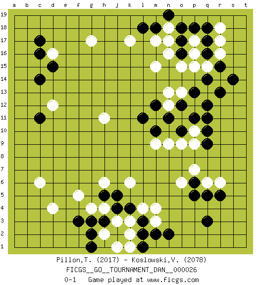 Last move : 0-1 2011 December 3 15:20:45 [Event "FICGS__GO__TOURNAMENT_DAN__000026 "] [Site "FICGS"] [Date "2011.05.22"] [Round "1"] [Black "Pillon,Thibault "] [White "Koslowski,Volker "] [Result "0-1"] [Rating 1 "2017"] [Rating 2 "2078"] 1.q16 d4 2.q3 d16 3.f3 c6 4.k4 r6 5.q5 q6 6.p6 p7 7.r5 o6 8.p5 m15 9.c14 h11 10.q10 p10 11.q9 p9 12.q11 d12 13.c17 k6 14.c16 h4 15.h3 o15 16.o17 p12 17.q12 j3 18.j4 h2 19.g3 k3 20.l3 l4 21.j2 k2 22.l2 j1 23.h5 g4 24.j5 f5 25.g2 m3 26.m2 m4 27.n2 h6 28.l1 k1 29.g1 q13 30.r13 r14 31.q14 g17 32.p13 o13 33.p11 o11 34.o12 n12 35.o10 o9 36.n11 m11 37.m10 n9 38.m12 n13 39.l11 n17 40.d15 p17 41.q17 m9 42.o16 p16 43.p18 p15 44.o18 n16 45.m18 q15 46.r15 r16 47.s14 r17 48.q18 n18 49.n19 m17 50.l18 k17 51.c11 r18 0-1 This go game has been lost on time (started : 2011.05.22 21:0:1) Here are the names of the openings (joseki) played in the four corners : Corner d4 : d4 f3Hoshi (Hwajeom, Seongjeom, Xingwei`) 4-4 Point. The star or hoshi (4-4) point, emphasizing influence at the potential expense of territory.Ikken Kakari (Hankan Keolch'im, Yi Gua`jiao~, 1-Space Low Approach). Black 2 is the standard approach move to the 4-4. Corner q4 : q3 r6Komoku (Somok, Xiao~mu`) 3-4 Point. The komoku (3-4) point is the traditional corner enclosure move..Niken Kakari (Dukan Keolch'im, E`r Gua`jiao~, 2-Space Low Approach). White 2 is used with friendly forces backing it up. Its purpose is to prevent a pincer. Locally it results in a loss, but may be appropriate fuseki strategy. It was popular in the late 1950s and early 1960s, but is not seen often nowadays, having been replaced by the one-space high approach, with which it has points in common. Corner q16 : q16 m15Hoshi (Hwajeom, Seongjeom, Xingwei`) 4-4 Point. The star or hoshi (4-4) point, emphasizing influence at the potential expense of territory. Corner d16 : d16 c14Hoshi (Hwajeom, Seongjeom, Xingwei`) 4-4 Point. The star or hoshi (4-4) point, emphasizing influence at the potential expense of territory.Ikken Kakari (Hankan Keolch'im, Yi Gua`jiao~, 1-Space Low Approach). Black 2 is the standard approach move to the 4-4. Player White won this Go (weiqi, baduk) game.Follow this game move after move (download ) There are players who don't accept exchange: they play many moves that perpetuate a previous state of the game. (Pierre Audouard) The intuitive mind is a sacred gift; the rational mind is a faithful servant. We have created a society that honors the servant but has forgotten the gift. (Albert Einstein)