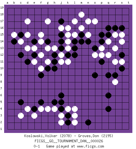 Last move : 0-1 2011 August 21 8:58:8 [Event "FICGS__GO__TOURNAMENT_DAN__000026"] [Site "FICGS"] [Date "2011.05.22"] [Round "1"] [Black "Koslowski,Volker"] [White "Groves,Don"] [Result "0-1"] [Rating 1 "2078"] [Rating 2 "2195"] 1.q16 d17 2.q4 c3 3.j6 h4 4.l13 q14 5.f9 r11 6.o9 l4 7.j4 j3 8.h5 g4 9.e14 c14 10.j17 o17 11.p15 l17 12.p14 g17 13.q13 r8 14.q6 r13 15.c5 d4 16.m17 m18 17.l16 m16 18.r14 q12 19.m15 n17 20.k3 k4 21.j5 l3 22.k2 j2 23.n2 l2 24.q9 p13 25.o13 n15 26.n14 l15 27.m14 k16 28.r9 r15 29.q15 s14 30.j15 k14 31.c15 d15 32.c12 d13 33.l14 k15 34.e12 e13 35.f13 f14 36.g14 f15 37.j13 f12 38.f5 f4 39.s16 g13 40.s10 o12 41.p11 p12 42.r16 s15 43.f11 g11 44.g10 e11 45.b14 b15 46.j14 k13 47.k12 j12 48.h12 j11 49.h11 k11 50.l12 f10 51.h10 j16 52.e4 e3 53.d11 h13 54.s12 s11 0-1 Here are the names of the openings (joseki) played in the four corners : Corner d4 : c3 j6 San-San (Sam-Sam, San-San) 3-3 Point. The San-San (3-3) point, emphasizing territory at the expense of influence. Corner d16 : d17 e14 Komoku (Somok, Xiao~mu`) 3-4 Point. The komoku (3-4) point is the traditional corner enclosure move.. Player White won this Go (weiqi, baduk) game. Follow this game move after move (download)You have to like to win, and to learn to recognize the errors that gave you the victory. (Pierre Audouard) He who laughs last probably does not get the joke. (Unknown)