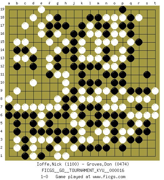 Last move : 1-0 2007 January 29 23:18:41 [Event "FICGS__GO__TOURNAMENT_KYU__000016"] [Site "FICGS"] [Date "2006.12.23"] [Round "1"] [Black "Ioffe,Nick"] [White "Groves,Don"] [Result "1-0"] [Rating 1 "1100"] [Rating 2 "0474"] 1.q16 c4 2.q3 c17 3.q9 f3 4.j4 d10 5.f16 o17 6.m17 o15 7.q14 d14 8.j16 e17 9.f17 e16 10.p17 p18 11.q18 p16 12.q17 n18 13.m18 p14 14.q13 p13 15.p12 o12 16.o11 n12 17.n11 m11 18.m10 l11 19.m12 m13 20.l12 l13 21.k12 k13 22.j12 k15 23.k10 m15 24.n16 o16 25.j14 k14 26.k16 m16 27.n17 l17 28.l18 l16 29.n13 o13 30.k17 f15 31.n14 n15 32.g15 g16 33.g17 h15 34.j15 g14 35.h17 m14 36.d6 c7 37.c6 d7 38.f6 e5 39.f5 e6 40.e4 e7 41.f4 e3 42.d4 d3 43.d5 c5 44.g3 f7 45.h7 g8 46.h8 h9 47.j9 h10 48.d12 f12 49.c14 c13 50.d13 c15 51.b14 b13 52.b12 b15 53.b6 b7 54.c3 b3 55.c2 b2 56.b4 d2 57.c1 r5 58.r4 q4 59.r3 p4 60.o3 r8 61.r9 q8 62.p6 o8 63.p11 l10 64.l9 m9 65.k11 m8 66.n6 m6 67.o4 n5 68.o6 m4 69.o5 q6 70.q5 r6 71.m7 p7 72.s9 s8 73.s5 s6 74.s4 p9 75.p10 o7 76.o9 n9 77.o10 t6 78.t8 t7 79.r7 n7 80.l7 t9 81.s11 p3 82.p2 n3 83.n2 n4 84.m2 l8 85.k7 k8 86.j8 k9 87.l10 q15 88.r15 r18 89.p19 o18 90.f11 g11 91.e18 d18 92.g13 f13 93.g12 h11 94.j13 g7 95.g6 f18 96.g18 e19 97.a7 a8 98.a6 b9 99.h14 g2 100.h2 h3 101.g4 j2 102.f2 d1 103.b5 g1 104.e1 k3 105.l2 l3 106.j3 h1 107.k2 k4 108.l5 l6 109.k6 j5 110.h4 j6 111.h6 j7 112.m5 k5 113.m6 1-0 Comment by player 1 : Nick Ioffe : No problem. The game is over only after both players pass. Prior to that just try your best to puzzle your opponent. Here are the names of the openings (joseki) played in the four corners : Corner d16 : c17 f16 San-San (Sam-Sam, San-San) 3-3 Point. The San-San (3-3) point, emphasizing territory at the expense of influence. Nikken Takagakari (Dukan Nop'dakeolch'im, E`r Gaogua`jiao~, 2-Space High Approach). White may continue with 4-5 or 4-6. White 4-6 works well when White is in the lower right (so an extension in the middle works both ways). The more conservative 4-5 is makes a slightly tighter shape (better for a fight). Corner q16 : q16 o17 Hoshi (Hwajeom, Seongjeom, Xingwei`) 4-4 Point. The star or hoshi (4-4) point, emphasizing influence at the potential expense of territory. Ikken Kakari (Hankan Keolch'im, Yi Gua`jiao~, 1-Space Low Approach). White 2 is the standard approach move to the 4-4. Player Black won this Go (weiqi, baduk) game. Follow this game move after move (download)Don't make dango's. (Anonymous) Man with more than one clock never knows what time it is. (Chinese thought)