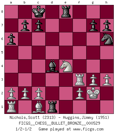 Last move : 1/2-1/2 2011 May 24 20:6:58 [Event "FICGS__CHESS__BULLET_BRONZE__000529"] [Site "FICGS"] [Date "2011.05.24"] [Round "1"] [White "Nichols,Scott"] [Black "Huggins,Jimmy"] [Result "1/2-1/2"] [WhiteElo "2313"] [BlackElo "1951"] 1.e4 Nc6 2.Nf3 d5 3.exd5 Qxd5 4.Nc3 Qd6 5.d4 Bg4 6.d5 Ne5 7.Be2 Bxf3 8.Bxf3 Nxf3+ 9.Qxf3 e5 10.O-O Nf6 11.Re1 Be7 12.Nb5 Qc5 13.Qb3 a6 14.Nc3 O-O-O 15.Rxe5 Ng4 16.Rf5 Bd6 17.g3 Rhe8 18.Kg2 Be5 19.Ne4 Qxd5 20.Qxd5 Rxd5 21.Rxf7 Rd1 22.h3 Nh6 23.Rf3 Bd4 1/2-1/2 KP : Nimzovich defense Kingside Castling by player White (move 10) Queenside Castling by player Black (move 14) This chess game ended in a draw. Follow this game move after move (download)In life, as in Chess, one's own Pawns block one's way. A man's very wealth, ease, leisure, children, books, which should help him to win, more often checkmate him. (Charles Buxton) Ich habe Putins Aufstieg an die Macht beobachtet und seine Politik, die demokratischen Institutionen meines Landes zu zerstören. (Garry Kasparov) El Ajedrez es un juego de pelea el cual es puramente intelectual e incluye la suerte. (Richard Reti) Je menace de comprendre la position. (Anonyme) The general who wins the battle makes many calculations in his temple before the battle is fought. The general who loses makes but few calculations beforehand. (Sun Tzu)