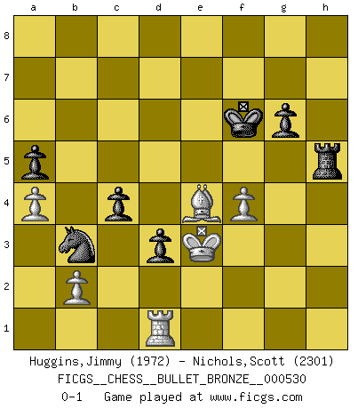 Last move : 0-1 2011 May 24 21:45:7 [Event "FICGS__CHESS__BULLET_BRONZE__000530"] [Site "FICGS"] [Date "2011.05.24"] [Round "1"] [White "Huggins,Jimmy"] [Black "Nichols,Scott"] [Result "0-1"] [WhiteElo "1972"] [BlackElo "2301"] 1.d4 Nf6 2.c4 e6 3.g3 d5 4.Bg2 Be7 5.Nf3 O-O 6.O-O dxc4 7.Qc2 a6 8.a4 Bd7 9.Qxc4 Bc6 10.Bf4 a5 11.Nc3 Na6 12.Rae1 Bd5 13.Nxd5 exd5 14.Qb5 Qc8 15.Qb3 Nb4 16.Nd2 c6 17.e4 Re8 18.e5 Nh5 19.Be3 g6 20.Nf3 Ng7 21.h3 b6 22.Nh2 Nf5 23.Ng4 Qe6 24.Rd1 h5 25.Nh2 c5 26.Nf3 Qd7 27.dxc5 bxc5 28.Bf4 Rac8 29.Rd2 Ng7 30.e6 Qxe6 31.Re1 Qb6 32.Ne5 Rcd8 33.Rde2 c4 34.Qf3 Nf5 35.Rd1 Bc5 36.Nd7 Qc6 37.Nxc5 Qxc5 38.Bg5 Nd4 39.Rxe8+ Rxe8 40.Qf6 Ne2+ 41.Kf1 d4 42.Bh6 Qe5 43.Qxe5 Rxe5 44.Bf4 Re8 45.Bg5 d3 46.g4 hxg4 47.hxg4 Kg7 48.Bd2 f6 49.Re1 Nc2 50.Rd1 Re5 51.Bb7 Ned4 52.Bf4 Re8 53.g5 fxg5 54.Bxg5 Nb3 55.Bd5 Rc8 56.Be7 Ncd4 57.Kg2 Nf5 58.Bg5 Rc5 59.Ba8 Nfd4 60.Be3 Kf6 61.f4 Rf5 62.Be4 Nc2 63.Kf2 Nxe3 64.Kxe3 Rh5 0-1 Catalan : Closed, 5.Nf3 Kingside Castling by player Black (move 5) Kingside Castling by player White (move 6) Player Black won this chess game. Follow this game move after move (download)All I want to do, ever, is just play Chess. (Bobby Fischer) Ein typischer, sehr verbreiteter Gedankenschädling ist der, daß der betreffende Amateur von der Annanhme ausgeht, daß jeder einzelne Zug etwas zu leisten habe. (Aaron Nimzowitsch) El hombre es un frívolo, una creatura engañosa y como un jugador de Ajedrez, se preocupa mas por el proceso de obtener su meta que de la meta por sí misma. (Dostoyevsky) Aucun coup ne doit être joué sans but. (Pedro Damiano) There are two major products that came out of Berkeley: LSD and UNIX. We do not believe this is to be a coincidence. (Jeremy S. Anderson)