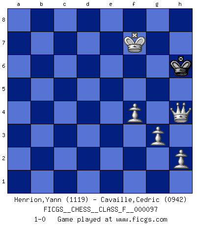 Last move : 1-0 2011 July 15 17:59:52 [Event "FICGS__CHESS__CLASS_F__000097"] [Site "FICGS"] [Date "2011.05.25"] [Round "1"] [White "Henrion,Yann"] [Black "Cavaille,Cedric"] [Result "1-0"] [WhiteElo "1119"] [BlackElo "0942"] 1.f4 d5 2.Nf3 e6 3.e3 Nf6 4.b3 c5 5.Bb2 Be7 6.Be2 O-O 7.O-O Nc6 8.Bb5 a6 9.Bxc6 bxc6 10.Ne5 Qc7 11.c4 dxc4 12.Nxc4 a5 13.Nc3 Nd5 14.e4 Nxc3 15.Bxc3 a4 16.e5 axb3 17.axb3 Rxa1 18.Qxa1 Qb7 19.Qb2 f6 20.exf6 Bxf6 21.Bxf6 gxf6 22.Nd6 Qd7 23.Nxc8 Qxc8 24.Re1 f5 25.Qc3 Qb7 26.Qxc5 Rd8 27.d4 Re8 28.b4 Kg7 29.Re3 Rb8 30.Rxe6 Qxb4 31.Rxc6 Qxc5 32.Rxc5 Rb1+ 33.Kf2 Rb2+ 34.Kg3 Rb3+ 35.Kh4 Kg6 36.g3 Rb8 37.Rc6+ Kg7 38.Kg5 Rg8 39.Rc7+ Kh8 40.Kxf5 Rd8 41.Kf6 Rf8+ 42.Rf7 Rxf7+ 43.Kxf7 h6 44.d5 Kh7 45.d6 h5 46.d7 Kh6 47.d8Q h4 48.Qxh4+ 1-0 Bird's Opening Kingside Castling by player Black (move 6) Kingside Castling by player White (move 7) 10 pieces endgame at move 32 : White KRPPPP , Black KRPP WHITE : King + 1 Rook 4 Pawns BLACK : King + 1 Rook 2 Pawns 9 pieces endgame at move 40 : White KRPPPP , Black KRP WHITE : King + 1 Rook 4 Pawns BLACK : King + 1 Rook 1 Pawn 8 pieces endgame at move 42 : White KPPPP , Black KRP WHITE : King + 4 Pawns BLACK : King + 1 Rook 1 Pawn 7 pieces endgame at move 43 : White KPPPP , Black KP WHITE : King + 4 Pawns BLACK : King + 1 Pawn Promotion Queen by player White (move 47) 6 pieces endgame at move 48 : White KQPPP , Black K WHITE : King + 1 Queen 3 Pawns BLACK : King + Player White won this chess game. Follow this game move after move (download)Life is like a game of Chess, changing with each move. (Chinese proverb) Computer sind die einzigen Gegner, die nicht immer eine Ausrede auf Lager haben, wenn sie gegen mich verlieren. (Robert James Fischer) No todos los artistas son jugadores de Ajedrez, pero todos los jugadores de Ajedrez son artistas. (Marcel Duchamp) Les échecs sont un jeu terrible. Si vous n'avez pas le centre, votre adversaire a une position plus libre. Par contre, si vous avez le centre, alors vous avez vraiment quelque chose pour laquelle vous inquiéter ! (Siegbert Tarrasch) If only people were all showed a certain minimum level of niceness; if only people didn't retract verbal draw offers (without draw box ticked) on ficgs; if only people didn't kill; if only people didn't run concentration / extermination camps, if only people didn't drop nuclear bombs on Hiroshima and Nagasaki, and so on - it would be a much more beautiful world. But sadly, things are not so... (Normajean Yates)