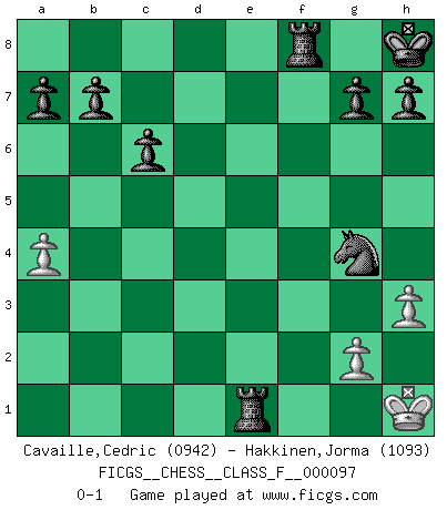 Last move : 0-1 2011 June 6 22:9:48 [Event "FICGS__CHESS__CLASS_F__000097"] [Site "FICGS"] [Date "2011.05.25"] [Round "1"] [White "Cavaille,Cedric"] [Black "Hakkinen,Jorma"] [Result "0-1"] [WhiteElo "0942"] [BlackElo "1093"] 1.e4 e5 2.Nf3 Nc6 3.Bc4 Nf6 4.Ng5 d5 5.Bb3 Be7 6.Nc3 Be6 7.Nxe6 fxe6 8.exd5 exd5 9.O-O Na5 10.Ba4+ c6 11.d4 e4 12.b4 Nc4 13.Qe2 O-O 14.Bb3 Bxb4 15.Bxc4 Bxc3 16.Bd2 Bxa1 17.Rxa1 dxc4 18.Qxc4+ Kh8 19.Bb4 Re8 20.a4 e3 21.fxe3 Rxe3 22.Kf2 Ng4+ 23.Kg1 Qf6 24.Qf1 Qxd4 25.c3 Rxc3 26.Kh1 Qxb4 27.Re1 Rf8 28.Qe2 Re3 29.h3 Qxe1+ 30.Qxe1 Rxe1+ 0-1 Two knights defense Kingside Castling by player White (move 9) Kingside Castling by player Black (move 13) Player Black won this chess game. Follow this game move after move (download)The stomach is an essential part of the Chess master. (Bent Larsen) Über Karpov: Er war und ist ein Vertreter der russischen Reaktionäre. Das steckt tief in seiner Seele, wehalb ich nicht nett mit ihm umgehen kann. (Viktor Kortschnoi) Siempre es mejor sacrificar los hombres de tu oponente. (Savielly Tartakower) Le plus grand jeu de l'esprit jamais inventé, plus vous l'apprenez, plus vous y prenez du plaisir. (Garry Kasparov) If you are good, you will be assigned all the work. If you are really good, you will get out of it. (Dan Rotaru)