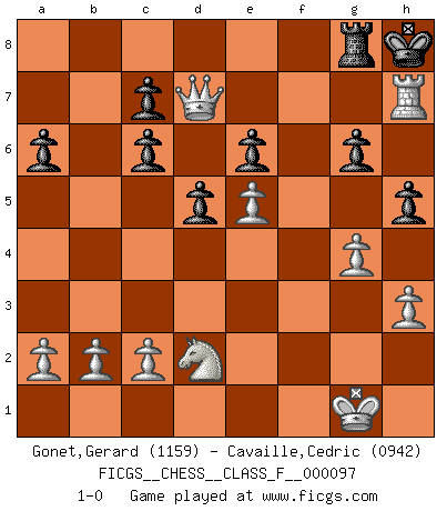 Last move : 1-0 2011 June 25 22:42:20 [Event "FICGS__CHESS__CLASS_F__000097"] [Site "FICGS"] [Date "2011.05.25"] [Round "1"] [White "Gonet,Gerard"] [Black "Cavaille,Cedric"] [Result "1-0"] [WhiteElo "1159"] [BlackElo "0942"] 1.d4 g6 2.e4 d6 3.f4 Bg7 4.Nf3 Nc6 5.Be3 Nh6 6.h3 O-O 7.Nbd2 Re8 8.Bb5 a6 9.Bxc6 bxc6 10.O-O d5 11.e5 Nf5 12.Bf2 f6 13.Qe1 fxe5 14.fxe5 e6 15.g4 Nd6 16.Bh4 Qd7 17.exd6 Qxd6 18.Ne5 Qxe5 19.dxe5 Rf8 20.Rxf8+ Kxf8 21.Qf2+ Kg8 22.Rf1 Bd7 23.Qf7+ Kh8 24.Bf6 Bxf6 25.Qxf6+ Kg8 26.Qf7+ Kh8 27.Qxd7 h5 28.Rf7 Rg8 29.Rh7+ 1-0 Modern defense Kingside Castling by player Black (move 6) Kingside Castling by player White (move 10) Player White won this chess game. Follow this game move after move (download)Fischer is under obligation to nobody. (Joseph Platz) Man gibt nur Pakete auf. (Paul Keres) Nunca nadie ha ganado una partida de Ajedrez rindiendose. (Unknown) Les ravages du H expliquent la différence de niveau entre Tal et Thal [Abergel]. Everybody lies. (Gregory House, House M.D.)