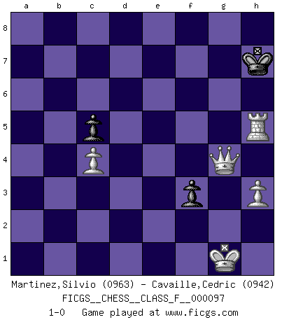 Last move : 1-0 2011 August 11 17:48:27 [Event "FICGS__CHESS__CLASS_F__000097"] [Site "FICGS"] [Date "2011.05.25"] [Round "1"] [White "Martinez,Silvio"] [Black "Cavaille,Cedric"] [Result "1-0"] [WhiteElo "0963"] [BlackElo "0942"] 1.e4 g6 2.Nf3 Bg7 3.Nc3 d6 4.d4 Nf6 5.d5 e6 6.Bb5+ Bd7 7.O-O exd5 8.Bxd7+ Nbxd7 9.exd5 O-O 10.Bf4 Qe8 11.Re1 Qd8 12.h3 Re8 13.Rxe8+ Qxe8 14.Nb5 Qc8 15.c4 a6 16.Nbd4 Nc5 17.b3 Nh5 18.Be3 Qd7 19.Rb1 b5 20.Qe2 a5 21.Nxb5 a4 22.Bxc5 dxc5 23.Ne5 Bxe5 24.Qxe5 c6 25.dxc6 Qxc6 26.Nc7 Qf6 27.Qxf6 Nxf6 28.Nxa8 axb3 29.axb3 Ne4 30.Nb6 f5 31.f3 Nc3 32.Rb2 h5 33.Rd2 Kg7 34.Na4 Nxa4 35.bxa4 g5 36.a5 Kg6 37.a6 f4 38.a7 g4 39.fxg4 hxg4 40.a8Q gxh3 41.gxh3 Kg5 42.Rd5+ Kh4 43.Qh8+ Kg3 44.Rd3+ f3 45.Qg7+ Kf4 46.Qg4+ Ke5 47.Rd5+ Kf6 48.Qf5 Ke7 49.Qe4 Kf6 50.Rf5+ Kg6 51.Qg4+ Kh7 52.Rh5+ 1-0 Robatsch (Modern) defense Kingside Castling by player White (move 7) Kingside Castling by player Black (move 9) 10 pieces endgame at move 39 : White KRPPPP , Black KPPP WHITE : King + 1 Rook 4 Pawns BLACK : King + 3 Pawns Promotion Queen by player White (move 40) 9 pieces endgame at move 40 : White KQRPP , Black KPPP WHITE : King + 1 Queen 1 Rook 2 Pawns BLACK : King + 3 Pawns 8 pieces endgame at move 41 : White KQRPP , Black KPP WHITE : King + 1 Queen 1 Rook 2 Pawns BLACK : King + 2 Pawns Player White won this chess game. Follow this game move after move (download)If Chess is a science, it's a most inexact one. If Chess is an art, it is too exacting to be seen as one. If Chess is a sport, it's too esoteric. If Chess is a game, it's too demanding to be just a game. If Chess is a mistress, she's a demanding one. If Chess is a passion, it's a rewarding one. If Chess is life, it's a sad one. (Unknown) Der Vorposten provoziert a) eine Basis für neue Angriffe und b) eine Schwächung der gegnerischen Widerstandskraft in der fraglichen Linie. (Aaron Nimzowitsch) Yo jugué Ajedrez con el y a veces le pude haber ganado solo que siempre devuelve su última jugada y juega la partida de manera diferente. (Mark Twain) Avant la finale, les dieux ont créé le milieu de partie. (Tarrasch) The worth of a book is to be measured by what you can carry away from it. (James Bryce)