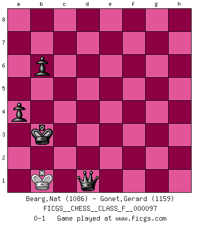 Last move : 0-1 2011 June 27 16:49:6 [Event "FICGS__CHESS__CLASS_F__000097"] [Site "FICGS"] [Date "2011.05.25"] [Round "1"] [White "Bearg,Nat"] [Black "Gonet,Gerard"] [Result "0-1"] [WhiteElo "1086"] [BlackElo "1159"] 1.e4 Nc6 2.Nf3 Nf6 3.Nc3 d5 4.exd5 Nxd5 5.Nxd5 Qxd5 6.Be2 e5 7.b3 Bd6 8.d3 h6 9.c4 Qe6 10.O-O Bd7 11.Qd2 O-O-O 12.a4 g5 13.Ba3 g4 14.Nh4 Be7 15.Bxe7 Qxe7 16.Nf5 Bxf5 17.a5 Nb4 18.f3 g3 19.hxg3 Bxd3 20.f4 Bxe2 21.Qxe2 e4 22.c5 Qxc5+ 23.Rf2 Rhe8 24.Re1 Nd3 25.Qd2 Nxf2 26.Qxf2 Qxf2+ 27.Kxf2 Rd3 28.Re3 Rd2+ 29.Ke1 f5 30.Kxd2 Rd8+ 31.Ke2 h5 32.b4 Kd7 33.b5 Kd6 34.a6 b6 35.Kf2 Kc5 36.Rb3 Rd2+ 37.Ke3 Rxg2 38.Rc3+ Kxb5 39.Kd4 Kxa6 40.Rxc7 Rxg3 41.Ke5 e3 42.Rc2 h4 43.Kxf5 h3 44.Ke4 Rg2 45.Kd3 Rxc2 46.Kxc2 h2 47.f5 h1Q 48.f6 Qc6+ 49.Kd3 Qxf6 50.Kxe3 Kb5 51.Kd3 Qe5 52.Kc2 Qe3 53.Kb2 Kb4 54.Kc2 Kc4 55.Kd1 a5 56.Kc2 Qd3+ 57.Kb2 Qc3+ 58.Kb1 a4 59.Ka2 Kb4 60.Kb1 Qd2 61.Ka1 Kb3 62.Kb1 Qd1+ 0-1 KP : Nimzovich defense Kingside Castling by player White (move 10) Queenside Castling by player Black (move 11) 10 pieces endgame at move 40 : White KRP , Black KRPPPPP WHITE : King + 1 Rook 1 Pawn BLACK : King + 1 Rook 5 Pawns 9 pieces endgame at move 43 : White KRP , Black KRPPPP WHITE : King + 1 Rook 1 Pawn BLACK : King + 1 Rook 4 Pawns 8 pieces endgame at move 45 : White KP , Black KRPPPP WHITE : King + 1 Pawn BLACK : King + 1 Rook 4 Pawns 7 pieces endgame at move 46 : White KP , Black KPPPP WHITE : King + 1 Pawn BLACK : King + 4 Pawns Promotion Queen by player Black (move 47) 6 pieces endgame at move 49 : White K , Black KQPPP WHITE : King + BLACK : King + 1 Queen 3 Pawns 5 pieces endgame at move 50 : White K , Black KQPP WHITE : King + BLACK : King + 1 Queen 2 Pawns Player Black won this chess game. Follow this game move after move (download)It's just you and your opponent at the board and you're trying to prove something. (Bobby Fischer) Ich glaube nicht an Psychologie, ich glaube an gute Züge. (Robert James Fischer) No existe un remordimiento como el remordimiento del Ajedrez. (H. G. Wells) La solitude du joueur d'Echecs à l'approche du mat est semblable à celle du condamné. (Francis Szpiner) If you know the enemy and know yourself you need not fear the results of a hundred battles. (Sun Tzu)
