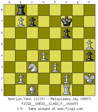 Last move : 1-0 2011 July 5 19:18:50 [Event "FICGS__CHESS__CLASS_F__000097"] [Site "FICGS"] [Date "2011.05.25"] [Round "1"] [White "Henrion,Yann"] [Black "Melquiades,Jay"] [Result "1-0"] [WhiteElo "1119"] [BlackElo "0897"] 1.d4 d5 2.c4 f6 3.Nc3 Nc6 4.e3 e6 5.cxd5 exd5 6.Bb5 Nge7 7.Nf3 a6 8.Bxc6+ Nxc6 9.O-O Bb4 10.a3 Bg4 11.axb4 Qd7 12.h3 Bh5 13.b5 g5 14.g4 Bxg4 15.hxg4 Ne7 16.bxa6 Ng6 17.axb7 Rb8 18.Ra8 O-O 19.Rxb8 Rxb8 20.Qb3 h5 21.Qxd5+ Qf7 22.Qxf7+ Kxf7 23.gxh5 Nh4 24.Nxh4 gxh4 25.Kh2 1-0 Queen's Gambit Kingside Castling by player White (move 9) Kingside Castling by player Black (move 18) Player White won this chess game. Follow this game move after move (download)Bobby Fischer is the greatest Chess genius of all time ! (Alexander Kotov) Alle Schachspieler sollten auch ein Hobby haben. (Savielly Grigorievitsch Tartakower) El Ajedrez no es una pizca de inferior al violín, y tenemos un gran número de violinistas profesionales. (Mikhail Botvinnik) Les Echecs, c'est l'art de la guerre sans les charniers, c'est la résurrection des morts tombés au champ d'honneur, l'espoir perpétuel, la suprématie de l'intelligence sur la force, la culture de l'esprit. (F. Szpiner) War is the child of passion, passion is the child of narcissism and narcissism is the child. (...) Another game ? (Thibault de Vassal)