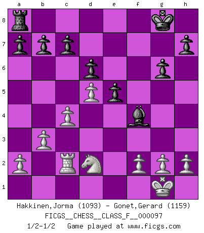 Last move : 1/2-1/2 2011 May 28 6:8:46 [Event "FICGS__CHESS__CLASS_F__000097"] [Site "FICGS"] [Date "2011.05.25"] [Round "1"] [White "Hakkinen,Jorma"] [Black "Gonet,Gerard"] [Result "1/2-1/2"] [WhiteElo "1093"] [BlackElo "1159"] 1.d4 Nf6 2.c4 g6 3.Nf3 Bg7 4.Nc3 O-O 5.e4 d6 6.Bd3 Nc6 7.O-O Bg4 8.Bg5 e5 9.d5 Ne7 10.Rc1 Ne8 11.b3 f6 12.Be3 f5 13.exf5 Nxf5 14.Bxf5 Bxf5 15.Re1 Nf6 16.Nd2 Ng4 17.Nce4 Nxe3 18.Rxe3 Bxe4 19.Rxe4 Qf6 20.Qf3 Qg5 21.Qe3 Bh6 22.Qxg5 Bxg5 23.Rc2 Rf4 24.Rxf4 Bxf4 1/2-1/2 King's Indian, 3.Nf3 Kingside Castling by player Black (move 4) Kingside Castling by player White (move 7) This chess game ended in a draw. Follow this game move after move (download)Pawn endings are to Chess what putting is to golf. (Cecil Purdy) Ohne Fehler kann es keine Brillanz geben. (Emanuel Lasker) Bobby es el jugador de Ajedrez mas fino que este país jamás haya producido. Su memoria para las movidas, su brillantez en soñar combinaciones y su feróz determinación por la victoria son algo extraño. (John Collins) Il n'y a plus de joueurs du niveau de Jacob Murray dont la seule quête est le beau jeu, le plaisir de voir les pièces construire quelque chose. Sur 10 idées à la minute, 9 seront sans intérêt, la dernière s'avèrera géniale. (Christian Bauer) A generalist learns less and less about more and more until he knows nothing about everything. (Author unknown)