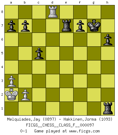 Last move : 0-1 2011 August 8 17:56:23 [Event "FICGS__CHESS__CLASS_F__000097"] [Site "FICGS"] [Date "2011.05.25"] [Round "1"] [White "Melquiades,Jay"] [Black "Hakkinen,Jorma"] [Result "0-1"] [WhiteElo "0897"] [BlackElo "1093"] 1.e4 e5 2.Nf3 Nc6 3.c3 Nf6 4.d3 g6 5.Bg5 Bg7 6.Nbd2 O-O 7.d4 exd4 8.Nxd4 Nxd4 9.cxd4 d6 10.e5 dxe5 11.dxe5 Qe8 12.f4 Bg4 13.Be2 Bxe2 14.Qxe2 Nd5 15.O-O-O Qc6+ 16.Kb1 Qb6 17.Nc4 Nc3+ 18.Kc2 Nxe2 19.Nxb6 cxb6 20.Rhe1 Rac8+ 21.Kb1 h6 22.Bh4 Nxf4 23.Rf1 Bxe5 24.Bg3 g5 25.Bxf4 Bxf4 26.g3 Be3 27.Rde1 Rfe8 28.h4 gxh4 29.gxh4 Re4 30.a3 Rce8 31.Rf5 Bc5 32.Rd1 Rxh4 33.Rd7 Re7 34.Rd8+ Kg7 35.Rxc5 Rh1+ 36.Ka2 bxc5 0-1 Ponziani : Jaenisch counter-attack Kingside Castling by player Black (move 6) Queenside Castling by player White (move 15) Player Black won this chess game. Follow this game move after move (download)The battle for the ultimate truth will never be won. And that's why Chess is so fascinating. (Hans Kmoch) Rauchen ist dem Schachspieler bei seiner Arbeit, also im Wettkampf, untersagt. (Viktor Kortschnoi) La última cosa en que Fischer estaba interesado era en tonterías, siempre y cuando el Ajedrez estuviera involucrado. (Elie Agur) La victoire dans une partie d'Echecs appartient la plupart du temps à celui qui voit un peu plus loin que l'adversaire. (Lasker) Go and wake up your luck. (Persian saying)
