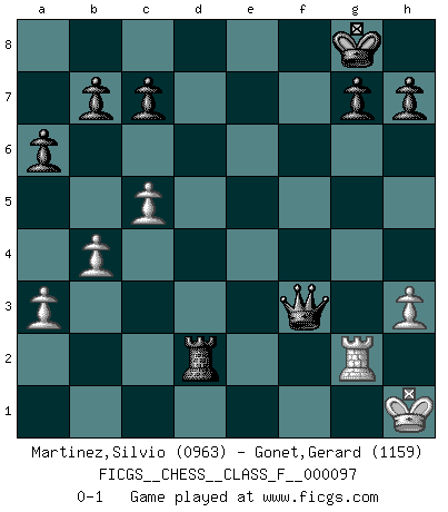 Last move : 0-1 2011 June 27 2:17:23 [Event "FICGS__CHESS__CLASS_F__000097"] [Site "FICGS"] [Date "2011.05.25"] [Round "1"] [White "Martinez,Silvio"] [Black "Gonet,Gerard"] [Result "0-1"] [WhiteElo "0963"] [BlackElo "1159"] 1.e4 Nc6 2.Nc3 e6 3.Nf3 d5 4.e5 f6 5.d4 Bb4 6.Bd2 Bxc3 7.Bxc3 a6 8.Bd3 Nh6 9.O-O O-O 10.a3 fxe5 11.dxe5 Nf7 12.h3 d4 13.Bxd4 Nxd4 14.Nxd4 Nxe5 15.Re1 Nxd3 16.Qxd3 Qf6 17.b4 Qxf2+ 18.Kh2 Qf4+ 19.Kh1 Rf6 20.Rf1 Qg5 21.Rxf6 Qxf6 22.c4 e5 23.Nf3 Be6 24.c5 Rd8 25.Qe4 Bd5 26.Qxe5 Qxe5 27.Re1 Qg3 28.Re2 Bxf3 29.gxf3 Qxf3+ 30.Rg2 Rd2 0-1 KP : Nimzovich defense Kingside Castling by player White (move 9) Kingside Castling by player Black (move 9) Player Black won this chess game. Follow this game move after move (download)When asked, -How is that you pick better moves than your opponents?, I responded: I'm very glad you asked me that, because, as it happens, there is a very simple answer. I think up my own moves, and I make my opponent think up his. (Alexander Alekhine) Wenn Dein Gegner dir ein Remis anbietet, versuch herauszufinden, weshalb er glaubt schlechter zu stehen. (Nigel Short) Tu eres para mi la Reina en d8 y yo soy el Peón en d7!!. (GM Eduard Gufeld) A ce moment-là, je menaçais de comprendre la position ! (Clément L'Heureux) I live to kill Traxler counterattack. (Ilmars Cirulis)