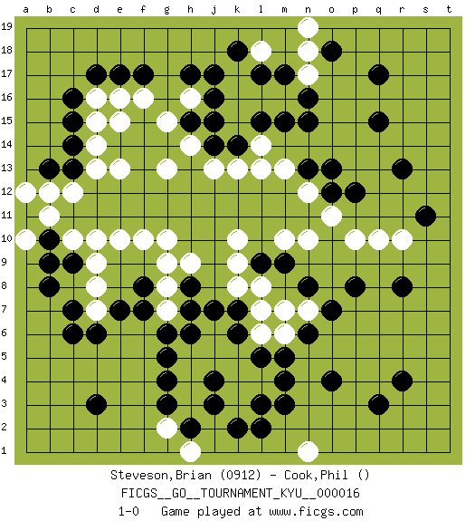 Last move : 1-0 2007 March 8 4:47:27 [Event "FICGS__GO__TOURNAMENT_KYU__000016"] [Site "FICGS"] [Date "2006.12.23"] [Round "1"] [Black "Steveson,Brian"] [White "Cook,Phil"] [Result "1-0"] [Rating 1 "0912"] 1.c16 k16 2.q17 q10 3.r4 k4 4.d3 c10 5.c6 d10 6.q15 p10 7.h17 k10 8.c13 g13 9.o4 g7 10.g3 n1 11.r8 n19 12.m17 n17 13.o18 n18 14.k18 f16 15.e17 e15 16.r13 d16 17.d17 e16 18.f17 d15 19.c15 d14 20.c14 e13 21.m3 r10 22.n15 m16 23.l17 l16 24.n16 c12 25.n13 n10 26.p8 k13 27.n8 k8 28.j3 k3 29.l2 d13 30.k6 k5 31.l5 j5 32.h6 h5 33.g6 j6 34.j7 l6 35.k7 l7 36.h7 g10 37.m5 m6 38.n6 l8 39.b8 d7 40.d6 d8 41.g5 b12 42.b13 a12 43.h15 g8 44.j14 m13 45.k14 l14 46.q3 n12 47.o13 k15 48.m15 l13 49.l15 j13 50.o12 o11 51.p12 h14 52.j15 k17 53.j17 l4 54.m4 g15 55.m9 m10 56.s11 n7 57.o7 m7 58.l9 k9 59.b10 b11 60.c9 d9 61.c7 l18 62.j16 h16 63.e7 e10 64.f7 f10 65.h8 h9 66.f8 g9 67.k2 h4 68.g4 a10 69.b9 h3 70.h2 h1 71.l3 g2 72.j4 1-0 Here are the names of the openings (joseki) played in the four corners : Player Black won this Go (weiqi, baduk) game. Follow this game move after move (download)Six eyes in a rectangle are alive. (Anonymous) Even the best needles are not sharp at both ends. (Chinese proverb)