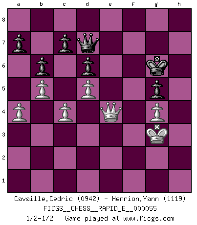 Last move : 1/2-1/2 2011 July 11 17:51:52 [Event "FICGS__CHESS__RAPID_E__000055"] [Site "FICGS"] [Date "2011.05.25"] [Round "1"] [White "Cavaille,Cedric"] [Black "Henrion,Yann"] [Result "1/2-1/2"] [WhiteElo "0942"] [BlackElo "1119"] 1.e4 e5 2.Nf3 Nc6 3.Bc4 h6 4.d4 exd4 5.Nxd4 Nxd4 6.Qxd4 d6 7.O-O Nf6 8.b4 Be7 9.a4 O-O 10.b5 b6 11.Nc3 Bb7 12.Bd5 Bxd5 13.exd5 Qd7 14.Ne4 Nxe4 15.Qxe4 Rfe8 16.Bb2 Bf6 17.Qb4 Bxb2 18.Qxb2 Qf5 19.Rfe1 Kf8 20.c4 Rxe1+ 21.Rxe1 f6 22.h3 Re8 23.Rxe8+ Kxe8 24.Qe2+ Kf7 25.g4 Qd7 26.Kg2 g5 27.Kg3 Kg6 28.f4 h5 29.fxg5 hxg4 30.hxg4 fxg5 31.Qe4+ Kf6 32.Qf3+ Kg6 33.Qe4+ Kf6 34.Qf3+ Kg6 35.Qe4+ 1/2-1/2 King's pawn game Kingside Castling by player White (move 7) Kingside Castling by player Black (move 9) This chess game ended in a draw. Follow this game move after move (download)There is only one thing Fischer does in Chess without pleasure: to lose ! (Boris Spassky) Jeder weiß, dass Gasprom Putins persönliches Machtinstrument ist. Die Firma wird vom Kreml aus geleitet und wird schon deshalb nie transparent sein. (Garry Kasparov) Mi estilo es algo parecido entre un poco de Tal y Petrosian. (Reshevsky) Lorsque vous vous retrouvez devant une position atroce, ne tendez pas un ultime piège dérisoire avec l'intention d'abandonner si l'adversaire le déjoue ! Faites-vous plutôt un devoir de résister comme si votre vie en dépendait. Jouez le coup qui vous déplairait au centuple si vous étiez dans la peau de votre tortionnaire ! It's not a bug - it's an undocumented feature. (Anonymous)