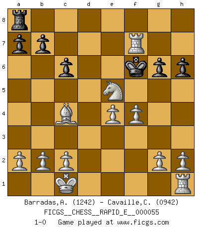 Last move : 1-0 2011 June 6 22:14:10 [Event "FICGS__CHESS__RAPID_E__000055"] [Site "FICGS"] [Date "2011.05.25"] [Round "1"] [White "Barradas,Anderson"] [Black "Cavaille,Cedric"] [Result "1-0"] [WhiteElo "1242"] [BlackElo "0942"] 1.e4 g6 2.d4 d6 3.Nc3 e5 4.dxe5 dxe5 5.Qxd8+ Kxd8 6.Be3 Bg7 7.O-O-O Nd7 8.Nd5 Ngf6 9.Bg5 h6 10.Bxf6+ Bxf6 11.Nxf6 Ke7 12.Nd5+ Kd8 13.Nf3 Nb6 14.Nxb6 Bd7 15.Nxa8 c6 16.Nxe5 Ke7 17.Rxd7+ Ke6 18.f4 Rxa8 19.Bc4+ Kf6 20.Rxf7+ 1-0 Robatsch (Modern) defense Queenside Castling by player White (move 7) Player White won this chess game. Follow this game move after move (download)Why must I lose to this idiot ? (Aron Nimzovich) Capablanka war das größte Genie der Schachgeschichte! Aber denken sie nicht er habe nichts vom Schach verstanden. Er wusste nur soviel wie er wissen musste um seine Ziele zu erreichen. (Mikhail Moiseyevich Botvinik) Desconfianza es la característica mas necesaria de un jugador de Ajedrez. (Siegbert Tarrasch) Le système Elo représente seulement une moyenne. Il est simplement un indicateur de votre stabilité. (Anatoli Karpov) Pretend inferiority and encourage his arrogance. (Sun Tzu)