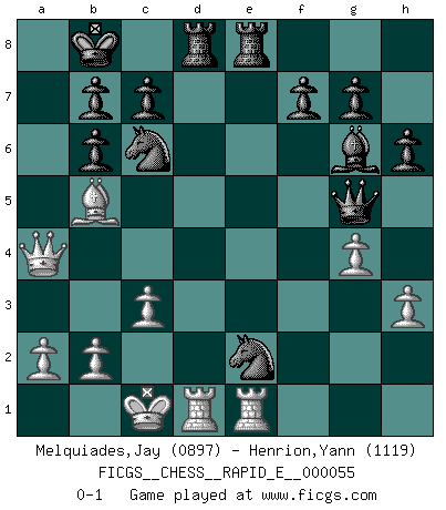 Last move : 0-1 2011 July 5 7:53:29 [Event "FICGS__CHESS__RAPID_E__000055"] [Site "FICGS"] [Date "2011.05.25"] [Round "1"] [White "Melquiades,Jay"] [Black "Henrion,Yann"] [Result "0-1"] [WhiteElo "0897"] [BlackElo "1119"] 1.e4 e5 2.Nf3 Nc6 3.c3 d6 4.d4 Bg4 5.h3 Bh5 6.g4 Bg6 7.Bd3 Nf6 8.dxe5 dxe5 9.Bg5 Be7 10.Nbd2 h6 11.Bb5 Qd7 12.Nxe5 Qd6 13.Nec4 Qd7 14.Nb6 axb6 15.e5 Nd5 16.Bxe7 Qxe7 17.Nf3 O-O-O 18.Qa4 Kb8 19.Nd4 Qxe5+ 20.Ne2 Rhe8 21.O-O-O Qg5+ 22.f4 Nxf4 23.Rhe1 Nxe2+ 0-1 Ponziani Opening Queenside Castling by player Black (move 17) Queenside Castling by player White (move 21) Player Black won this chess game. Follow this game move after move (download)In Chess, at least, the brave inherit the earth. (Edmar Mednis) Ein unbeabsichtigtes Patt ist der Gipfel der Dummheit. (Anonymous) La señal de un Gran Maestro es su habilidad de ganar una partida rápidamente y sin dolor. (Irving Chernev) Ce n'est pas pour s'amuser qu'il joue aux échecs : il célèbre un culte. (Vladimir Nabokov) Those who make the worst use of their time are the first to complain of its brevity. (Jean de la Bruyere)