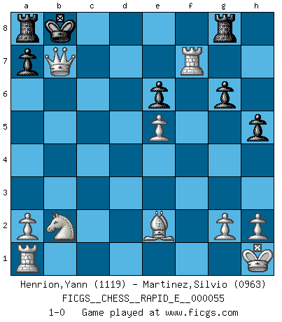 Last move : 1-0 2011 June 14 8:5:17 [Event "FICGS__CHESS__RAPID_E__000055"] [Site "FICGS"] [Date "2011.05.25"] [Round "1"] [White "Henrion,Yann"] [Black "Martinez,Silvio"] [Result "1-0"] [WhiteElo "1119"] [BlackElo "0963"] 1.f4 Nh6 2.d3 d5 3.Nf3 Nc6 4.e4 e6 5.Ne5 Nxe5 6.fxe5 g6 7.Be2 Bc5 8.d4 Bb6 9.Bxh6 c6 10.exd5 cxd5 11.O-O Qh4 12.Bg7 Rg8 13.Bf6 Qxd4+ 14.Kh1 Qxb2 15.Nd2 Bd8 16.Bxd8 Kxd8 17.c4 dxc4 18.Nxc4 Bd7 19.Nxb2 h5 20.Rxf7 Kc7 21.Qxd7+ Kb8 22.Qxb7+ 1-0 Bird's Opening Kingside Castling by player White (move 11) Player White won this chess game. Follow this game move after move (download)White lost because he failed to remember the right continuation and had to think up the moves himself. (Siegbert Tarrasch) Wenn ein Kopf und ein Buch zusammenstoßen und es klingt hohl, ist es denn allemal im Buche? (Georg Christoph Lichtenberg) Los errores estan ahí, esperando a que se cometan. (Savielly Tartakower) Comme les marins qui ont mille raisons différentes d'aller en mer, les joueurs d'échecs en ont tout autant avant de s'installer devant une table et jouer... (Vincent Bertignac, philosophe) I find your interest interesting. (Gregory House, House M.D.)