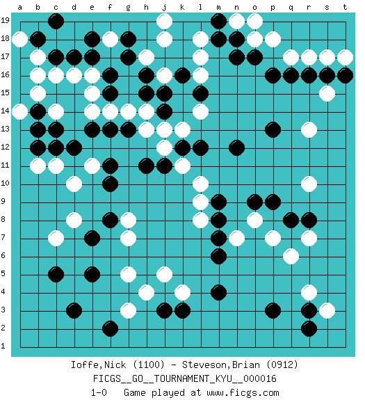 Last move : 1-0 2007 February 14 22:42:32 [Event "FICGS__GO__TOURNAMENT_KYU__000016 "] [Site "FICGS"] [Date "2006.12.23"] [Round "1"] [Black "Ioffe,Nick "] [White "Steveson,Brian "] [Result "1-0"] [Rating 1 "1100"] [Rating 2 "0912"] 1.q16 r4 2.d3 c16 3.p3 q6 4.m4 d10 5.e17 e16 6.f16 e15 7.d17 r10 8.c5 r13 9.n17 c7 10.e5 k4 11.m6 g3 12.j3 g5 13.k3 j5 14.e7 d8 15.r3 s15 16.s16 h4 17.f2 g7 18.f8 g8 19.f10 l8 20.m8 l9 21.m9 l10 22.d12 e11 23.e13 c14 24.c17 f14 25.f13 g14 26.f11 c11 27.c12 b11 28.b12 h17 29.h16 j16 30.h15 l17 31.j14 h13 32.h11 j12 33.j11 k11 34.k12 k13 35.l12 j13 36.f15 e14 37.g13 h14 38.j15 l14 39.n12 l16 40.r8 s3 41.r2 r7 42.q8 o8 43.o9 p7 44.p9 f18 45.g17 j18 46.g18 n7 47.m7 r17 48.r16 s17 49.t16 q17 50.p16 o18 51.o17 p18 52.n18 n19 53.m19 o19 54.m18 t17 55.p13 b17 56.b18 b16 57.b14 b15 58.c13 a18 59.c19 a14 60.b13 d16 61.e18 l18 62.k16 j19 63.l15 1-0 Here are the names of the openings (joseki) played in the four corners : Corner q4 : r4 p3Komoku (Somok, Xiao~mu`) 3-4 Point. The komoku (3-4) point is the traditional corner enclosure move..Ikken Kakari (Hankan Keolch'im, Yi Gua`jiao~, 1-Space Low Pincer). The small knight move is the basic approach move to the 3-4 point stone. It has been continually used for over four centuries. There are limitless variations, with new moves constantly being discovered. Black 2 opens the door to a treaure store of joseki. Corner d16 : c16 e17Komoku (Somok, Xiao~mu`) 3-4 Point. The komoku (3-4) point is the traditional corner enclosure move..Ikken Kakari (Hankan Keolch'im, Yi Gua`jiao~, 1-Space Low Pincer). The small knight move is the basic approach move to the 3-4 point stone. It has been continually used for over four centuries. There are limitless variations, with new moves constantly being discovered. Black 2 opens the door to a treaure store of joseki. Corner q16 : q16 r13Hoshi (Hwajeom, Seongjeom, Xingwei`) 4-4 Point. The star or hoshi (4-4) point, emphasizing influence at the potential expense of territory.Nikken Kakari (Dukan Keolch'im, E`r Gua`jiao~, 2-Space Low Approach). Black typically answers by 7-3 or 3-5 (which is not joseki). Player Black won this Go (weiqi, baduk) game.Follow this game move after move (download ) A basic: Don't push too hard. (Jansteen) When you stop learning you start dying. (Scott Adams)