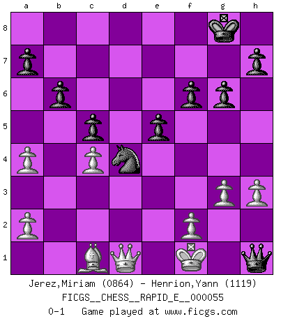 Last move : 0-1 2011 June 18 3:28:58 [Event "FICGS__CHESS__RAPID_E__000055"] [Site "FICGS"] [Date "2011.05.25"] [Round "1"] [White "Jerez,Miriam"] [Black "Henrion,Yann"] [Result "0-1"] [WhiteElo "0864"] [BlackElo "1119"] 1.e4 c5 2.Na3 e6 3.Nf3 Nf6 4.d4 cxd4 5.Nxd4 Bxa3 6.bxa3 Nxe4 7.Bd3 Nc3 8.Qd2 Nd5 9.O-O O-O 10.Bb2 Nc6 11.Nxc6 dxc6 12.c4 Ne7 13.Qc3 f6 14.Qc2 g6 15.Rad1 Qc7 16.Rfe1 e5 17.a4 Bf5 18.Bxf5 Nxf5 19.h3 Rad8 20.Rxd8 Rxd8 21.Ba3 b6 22.g3 c5 23.Bc1 Qc6 24.Rd1 Rxd1+ 25.Qxd1 Nd4 26.Kf1 Qh1+ 0-1 Sicilian defense Kingside Castling by player White (move 9) Kingside Castling by player Black (move 9) Player Black won this chess game. Follow this game move after move (download)When you absolutely don't know what to do anymore, it is time to panic. (John van der Wiel) Du musst Deinen Gegner in einen tiefen dunklen Wald führen wo 2+2=5 ist und wo der Weg, der wieder hinausführt, nur breit genug für einen ist. (Mikhail Nekhemyevich Tal) El Ajedrez es como la guerra en un tablero. (Bobby Fischer) Il n'y a plus de joueurs du niveau de Jacob Murray dont la seule quête est le beau jeu, le plaisir de voir les pièces construire quelque chose. Sur 10 idées à la minute, 9 seront sans intérêt, la dernière s'avèrera géniale. (Christian Bauer) A generalist learns less and less about more and more until he knows nothing about everything. (Author unknown)