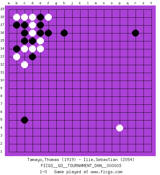 Last move : 1-0 2007 February 28 0:1:27 [Event "FICGS__GO__TOURNAMENT_DAN__000003"] [Site "FICGS"] [Date "2006.12.24"] [Round "1"] [Black "Tamayo,Thomas"] [White "Ilie,Sebastian"] [Result "1-0"] [Rating 1 "1919"] [Rating 2 "2054"] 1.r16 d17 2.c5 p4 3.c15 c12 4.e16 d16 5.d15 e15 6.f16 e14 7.b17 f18 8.h16 b18 9.c17 c18 10.d13 d14 11.c16 c14 12.b14 b13 13.e17 d18 14.e18 1-0 This go game has been lost on time (started : 2006.12.24 7:56:35) Here are the names of the openings (joseki) played in the four corners : Corner d16 : d17 c15 Komoku (Somok, Xiao~mu`) 3-4 Point. The komoku (3-4) point is the traditional corner enclosure move.. Ikken Kakari (Hankan Keolch'im, Yi Gua`jiao~, 1-Space Low Pincer). The small knight move is the basic approach move to the 3-4 point stone. It has been continually used for over four centuries. There are limitless variations, with new moves constantly being discovered. Black 2 opens the door to a treaure store of joseki. Corner d4 : c5 1-0 Mokuhazushi (Waemok, Wai`mu`) 5-3 Point. The mokuhazushi (5-3) point was popular in the Edo period in Japan (1600 - 1867). It emphasizes influence; territorially, it is inferior to the 3-4 point. Player Black won this Go (weiqi, baduk) game. Follow this game move after move (download)Don't make empty triangles. (Anonymous) Now you put water in a cup, it becomes the cup; You put water into a bottle it becomes the bottle; You put it in a teapot it becomes the teapot. Water can flow or it can crash. Be water, my friend. (Bruce Lee)