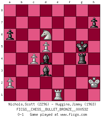 Last move : 0-1 2011 May 25 22:10:27 [Event "FICGS__CHESS__BULLET_BRONZE__000532"] [Site "FICGS"] [Date "2011.05.25"] [Round "1"] [White "Nichols,Scott"] [Black "Huggins,Jimmy"] [Result "0-1"] [WhiteElo "2296"] [BlackElo "1963"] 1.e4 c5 2.Nf3 Nc6 3.d4 cxd4 4.Nxd4 Nf6 5.Nc3 e5 6.Ndb5 d6 7.Nd5 Nxd5 8.exd5 Nb8 9.c4 Be7 10.Bd3 O-O 11.O-O a6 12.Nc3 f5 13.f3 Nd7 14.Be3 Bg5 15.Bf2 Qf6 16.Bc2 Qh6 17.h3 Bf4 18.Qd3 e4 19.fxe4 Ne5 20.Qe2 fxe4 21.Bd4 Bg4 22.Qxe4 Bh5 23.Bxe5 Bxe5 24.Qh4 g5 25.Qe1 Rxf1+ 26.Qxf1 Rf8 27.Qd3 g4 28.Ne4 Bg6 29.Re1 Bxb2 30.Kh1 Rf4 31.Qe2 Qh4 32.Nxd6 Bxc2 33.Qe6+ Kg7 34.Qe7+ Qxe7 35.Rxe7+ Kg6 36.hxg4 Rxg4 37.g3 Rxg3 38.Nxb7 Rg4 39.Nd6 Bd4 40.Kh2 Kg5 41.Re1 Bd3 0-1 Sicilian : Pelikan (Lasker/Sveshnikov) variation Kingside Castling by player Black (move 10) Kingside Castling by player White (move 11) Player Black won this chess game. Follow this game move after move (download)A good sacrifice is one that is not necessarily sound but leaves your opponent dazed and confused. (Rudolph Spielmann) Wenn ein Kopf und ein Buch zusammenstoßen und es klingt hohl, ist es denn allemal im Buche? (Georg Christoph Lichtenberg) Cuando tengo las piezas blancas, yo gano porque soy blanco; Cuando tengo las piezas negras, yo gano porque soy Bogolyubov. (Bogolyubov) Pour se monter efficace, un Cavalier a besoin d'avant-postes ! Les Cavaliers font les meilleurs bloqueurs de pions passés. They say poker is a zero-sum game. It must be, because every time I play my sum ends up zero. (Max Shapiro)