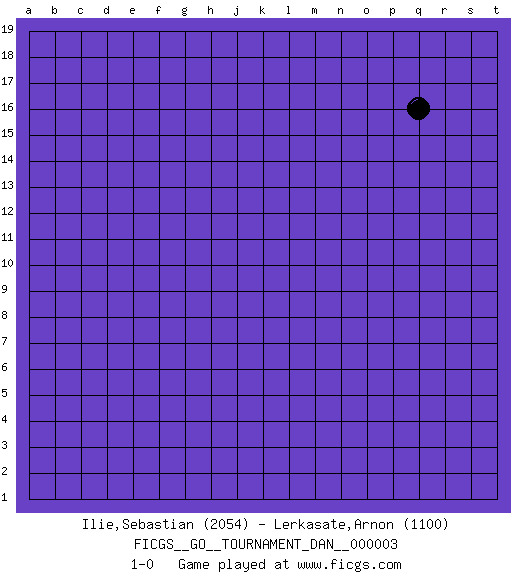 Last move : 1-0 2007 February 2 8:31:49 [Event "FICGS__GO__TOURNAMENT_DAN__000003"] [Site "FICGS"] [Date "2006.12.24"] [Round "1"] [Black "Ilie,Sebastian"] [White "Lerkasate,Arnon"] [Result "1-0"] [Rating 1 "2054"] [Rating 2 "1100"] 1.q16 1-0 This go game has been lost on time (started : 2006.12.24 7:56:35) Here are the names of the openings (joseki) played in the four corners : Player Black won this Go (weiqi, baduk) game. Follow this game move after move (download)Don't make dango's. (Anonymous) See no evil, hear no evil, speak no evil. (The 3 monkeys)
