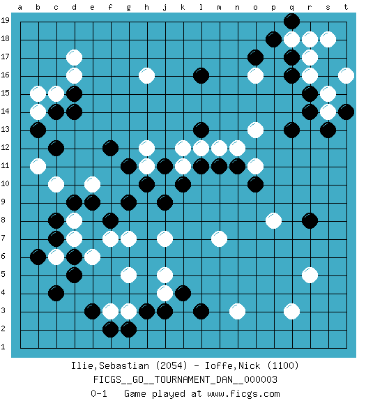 Last move : 0-1 2007 April 12 16:51:35 [Event "FICGS__GO__TOURNAMENT_DAN__000003"] [Site "FICGS"] [Date "2006.12.24"] [Round "1"] [Black "Ilie,Sebastian"] [White "Ioffe,Nick"] [Result "0-1"] [Rating 1 "2054"] [Rating 2 "1100"] 1.q16 d17 2.c4 q3 3.e3 o16 4.l16 o13 5.q13 c10 6.l13 r17 7.q17 r16 8.r15 s15 9.r14 s14 10.s13 q18 11.p18 s18 12.q19 r18 13.o17 r5 14.t14 t16 15.l3 h16 16.d14 c15 17.c14 b14 18.b13 b15 19.c12 e10 20.c8 b11 21.f12 d8 22.c7 d7 23.d6 c6 24.b6 e6 25.d5 h12 26.g11 h11 27.g9 g7 28.h10 j7 29.f8 f7 30.d9 g3 31.e9 n3 32.j3 j4 33.k4 j5 34.h3 g5 35.g2 f3 36.f2 m7 37.d15 d16 38.r8 o11 39.l11 j10 40.j9 k12 41.k10 k11 42.j11 l12 43.m11 m12 44.n11 n12 45.o10 p8 0-1 This go game has been lost on time (started : 2006.12.24 7:56:35) Here are the names of the openings (joseki) played in the four corners : Corner q16 : q16 o16 Hoshi (Hwajeom, Seongjeom, Xingwei`) 4-4 Point. The star or hoshi (4-4) point, emphasizing influence at the potential expense of territory. Ikken Takagakari (Hankan Nop'dakeolch'im, Yi Gaojia, 1-Space High Approach). Black typically responds at 6-4 or 3-10. Black 4-10 is played when Black finds play on the right side advantageous. Black 4-8 or 3-8 may be played when Black has support at top. Player White won this Go (weiqi, baduk) game. Follow this game move after move (download)If you have won four corners, resign. (Anonymous) At last I discovered the true beauty of chess. So I proposed to her. (Dinesh De Silva)