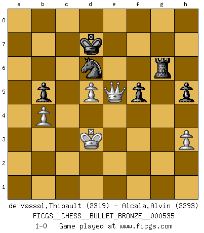 Last move : 1-0 2011 May 30 17:32:3 [Event "FICGS__CHESS__BULLET_BRONZE__000535"] [Site "FICGS"] [Date "2011.05.30"] [Round "1"] [White "de Vassal,Thibault"] [Black "Alcala,Alvin"] [Result "1-0"] [WhiteElo "2319"] [BlackElo "2293"] 1.e4 c5 2.Nf3 d6 3.d4 cxd4 4.Nxd4 Nf6 5.Nc3 a6 6.Be3 e5 7.Nb3 Be6 8.f3 h5 9.Qd2 Nbd7 10.Nd5 Nxd5 11.exd5 Bf5 12.Be2 Qh4+ 13.g3 Qd8 14.O-O-O Be7 15.Kb1 Nf6 16.h3 Rc8 17.Bd3 Bxd3 18.Qxd3 Qc7 19.f4 exf4 20.gxf4 Qc4 21.Qd2 Kd7 22.Na5 Qc7 23.c4 Bd8 24.b4 Ke8 25.c5 Ne4 26.Qd3 f5 27.Nc4 Bf6 28.Rc1 dxc5 29.Bxc5 b5 30.Ne5 Bxe5 31.Bd4 Qd7 32.Rxc8+ Qxc8 33.Rc1 Qxc1+ 34.Kxc1 Bxf4+ 35.Kc2 Rh6 36.a4 Nd6 37.Bxg7 Rg6 38.Qf3 Rxg7 39.Qxf4 Rg6 40.axb5 axb5 41.Kd3 Kd7 42.Qe5 1-0 Sicilian : Najdorf, Byrne (English) attack Queenside Castling by player White (move 14) Player White won this chess game. Follow this game move after move (download)Different people feel differently about resigning. (Bobby Fischer) Um sich vor der Gefahr einer Erkältung zu schützen, sorge der wanderlustige König beizeiten für ein brauchbares Versteck. (Aaron Nimzowitsch) El Ajedrez es sobre todo, ¡una pelea!. (Emanuel Lasker) Le système Elo représente seulement une moyenne. Il est simplement un indicateur de votre stabilité. (Anatoli Karpov) Do you know these so called Volunteers don't even get paid! (Simpsons)