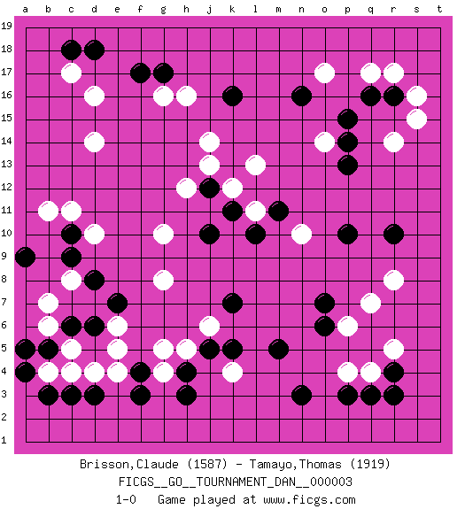 Last move : 1-0 2007 January 30 21:56:30 [Event "FICGS__GO__TOURNAMENT_DAN__000003 "] [Site "FICGS"] [Date "2006.12.24"] [Round "1"] [Black "Brisson,Claude "] [White "Tamayo,Thomas "] [Result "1-0"] [Rating 1 "1587"] [Rating 2 "1919"] 1.q16 d4 2.r4 p4 3.n3 r14 4.p3 o17 5.p15 r17 6.r16 q17 7.n16 d16 8.r10 q4 9.q3 r5 10.r3 q7 11.p10 d10 12.o7 p6 13.o6 r8 14.f3 s16 15.d6 s15 16.c3 n10 17.p13 c4 18.d3 e4 19.f4 e5 20.b3 e6 21.f17 d14 22.d18 c17 23.c18 k4 24.m5 g5 25.h4 h5 26.j5 g4 27.h3 j6 28.k5 g16 29.g17 h16 30.e7 g8 31.j10 g10 32.k7 o14 33.p14 l11 34.j12 l13 35.k16 j14 36.l10 k12 37.k11 j13 38.m11 h12 39.c10 c11 40.c9 b11 41.b5 b4 42.a4 b6 43.c6 c5 44.a5 b7 45.a9 c8 46.d8 1-0 Here are the names of the openings (joseki) played in the four corners : Corner q4 : r4 p4Komoku (Somok, Xiao~mu`) 3-4 Point. The komoku (3-4) point is the traditional corner enclosure move..Ikken Takagakari (Hankan Nop'dakeolch'im, Yi Gaogua`jiao~, 1-Space High Approach). The 5-4 approach move has become more popular in modern times, as modern Go emphasizes speed and influence. Corner q16 : q16 r14Hoshi (Hwajeom, Seongjeom, Xingwei`) 4-4 Point. The star or hoshi (4-4) point, emphasizing influence at the potential expense of territory.Ikken Kakari (Hankan Keolch'im, Yi Gua`jiao~, 1-Space Low Approach). White 2 is the standard approach move to the 4-4. Corner d4 : d4 f3Hoshi (Hwajeom, Seongjeom, Xingwei`) 4-4 Point. The star or hoshi (4-4) point, emphasizing influence at the potential expense of territory.Ikken Kakari (Hankan Keolch'im, Yi Gua`jiao~, 1-Space Low Approach). Black 2 is the standard approach move to the 4-4. Corner d16 : d16 f17Hoshi (Hwajeom, Seongjeom, Xingwei`) 4-4 Point. The star or hoshi (4-4) point, emphasizing influence at the potential expense of territory.Ikken Kakari (Hankan Keolch'im, Yi Gua`jiao~, 1-Space Low Approach). Black 2 is the standard approach move to the 4-4. Player Black won this Go (weiqi, baduk) game.Follow this game move after move (download ) A meijin needs no joseki. (Anonymous) There is a very easy way to return from a casino with a small fortune : go there with a large one. (Jack Yelton)