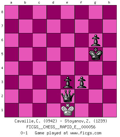 Last move : 0-1 2011 August 22 17:25:43 [Event "FICGS__CHESS__RAPID_E__000056"] [Site "FICGS"] [Date "2011.05.31"] [Round "1"] [White "Cavaille,Cedric"] [Black "Stoyanov,Zdravko"] [Result "0-1"] [WhiteElo "0942"] [BlackElo "1239"] 1.e4 c5 2.Nf3 e6 3.d4 cxd4 4.Qxd4 Nc6 5.Qd1 a6 6.Nc3 Bb4 7.a3 Ba5 8.e5 h6 9.b4 Bb6 10.Bc4 Nge7 11.O-O O-O 12.Be3 Bxe3 13.fxe3 Ng6 14.b5 axb5 15.Bxb5 Ncxe5 16.Nxe5 Nxe5 17.a4 Qc7 18.Ne4 d5 19.Ng3 Bd7 20.Bxd7 Qxd7 21.Qd4 Nc4 22.Nh5 e5 23.Qc3 Rxa4 24.Rxa4 Qxa4 25.Qb3 Qd7 26.Ra1 Qg4 27.Ng3 Qg5 28.Nf1 b6 29.Qd3 e4 30.Qd4 f5 31.Qxd5+ Kh8 32.Qxc4 Qf6 33.Qd4 Qc6 34.Ra7 Rf6 35.Qd8+ Kh7 36.Qc7 Qxc7 37.Rxc7 Rd6 38.c4 h5 39.Kf2 Kh6 40.Ng3 g6 41.Ne2 Rd2 42.Ke1 Rc2 43.Kd1 Rb2 44.Ke1 b5 45.c5 b4 46.Nd4 Rxg2 47.Rb7 Rxh2 48.Rxb4 Ra2 49.Rc4 h4 50.c6 Ra8 51.c7 Rc8 52.Nb5 h3 53.Na7 Rxc7 54.Rxc7 h2 55.Kf2 h1Q 56.Rc8 Qf3+ 57.Ke1 Qxe3+ 58.Kf1 Qxa7 59.Rh8+ Kg5 60.Ke2 Qa6+ 61.Kf2 Qa7+ 62.Kg3 Qc7+ 63.Kh3 Qc3+ 64.Kg2 Qxh8 65.Kg3 f4+ 66.Kf2 Qh2+ 67.Ke1 f3 68.Kd1 e3 69.Ke1 Qe2+ 0-1 Sicilian defense Kingside Castling by player White (move 11) Kingside Castling by player Black (move 11) 10 pieces endgame at move 53 : White KRNP , Black KRPPPP WHITE : King + 1 Rook 1 Knight 1 Pawn BLACK : King + 1 Rook 4 Pawns 9 pieces endgame at move 54 : White KRNP , Black KPPPP WHITE : King + 1 Rook 1 Knight 1 Pawn BLACK : King + 4 Pawns Promotion Queen by player Black (move 55) 8 pieces endgame at move 57 : White KRN , Black KQPPP WHITE : King + 1 Rook 1 Knight BLACK : King + 1 Queen 3 Pawns 7 pieces endgame at move 58 : White KR , Black KQPPP WHITE : King + 1 Rook BLACK : King + 1 Queen 3 Pawns 6 pieces endgame at move 64 : White K , Black KQPPP WHITE : King + BLACK : King + 1 Queen 3 Pawns Player Black won this chess game. Follow this game move after move (download)All I want to do, ever, is just play Chess. (Bobby Fischer) Schach ist ein Teil der Kultur, und wenn es mit der Kultur abwärts geht, geht es auch mit dem Schach abwärts. (Mikhail Moiseyevich Botvinik) Las combinaciones han sido siempre el aspecto más intrigante del Ajedrez. Los Maestros las buscan, el público las aplauden, los críticos las alaban. La razón se debe a que las combinaciones hacen posible que el Ajedrez sea más que un ejercicio matemático con una carencia de vida. Ellas son la poesía del juego, son del Ajedrez lo que la melodía es de la música. Ellas representan el triunfo de la mente sobre la materia. (Reuben Fine) J'ai vu le vaincu d'Echecs jouer des années durant dans l'espoir de la fête de la victoire. Car tu es plus riche de ce qu'elle existe si même elle n'est point pour toi. Ainsi de la perle du fond des mers. (Antoine de Saint-Exupéry) They misunderestimated me. (George W. Bush, Bentonville nov. 6, 2000)