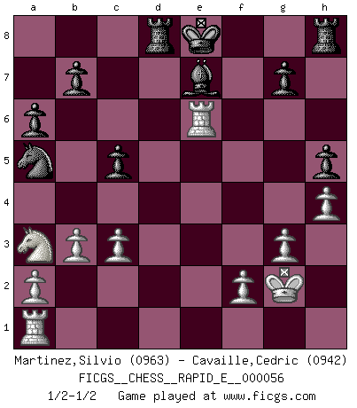 Last move : 1/2-1/2 2011 June 29 23:39:54 [Event "FICGS__CHESS__RAPID_E__000056"] [Site "FICGS"] [Date "2011.05.31"] [Round "1"] [White "Martinez,Silvio"] [Black "Cavaille,Cedric"] [Result "1/2-1/2"] [WhiteElo "0963"] [BlackElo "0942"] 1.e4 c5 2.Na3 d6 3.Nf3 Nf6 4.Bc4 h6 5.O-O e6 6.d3 d5 7.exd5 Nxd5 8.Re1 Nc6 9.Bf4 Nxf4 10.b3 a6 11.g3 Nh3+ 12.Kg2 Ng5 13.Nxg5 Qxg5 14.c3 h5 15.d4 Bd6 16.h4 Qd8 17.d5 Na5 18.dxe6 Bxe6 19.Bxe6 fxe6 20.Rxe6+ Be7 21.Qxd8+ Rxd8 1/2-1/2 Sicilian defense Kingside Castling by player White (move 5) This chess game ended in a draw. Follow this game move after move (download)Chess is a terrible game. If you have no center, your opponent has a freer position. If you do have a center, then you really have something to worry about ! (Siegbert Tarrasch) Ohne Leiden bildet sich kein Charakter. (Ernst Freiherr von Feuchtersleben) Nunca antes ha habido un jugador de Ajedrez con tal conocimiento a fondo de las complejidades del juego y una inmensa voluntad absolutamente indomable de ganar. Yo pienso que Fischer es el jugador mas grande que jamás haya existido. (Lisa Lane) On a dit que l'homme se distingue de l'animal par le fait qu'il achète plus de livres qu'il ne peut en lire. Je voudrais suggérer qu'inclure à la liste des livres quelques livres d'échecs rendrait la distinction manifeste. (Edward Lasker) He who laughs last probably does not get the joke. (Unknown)