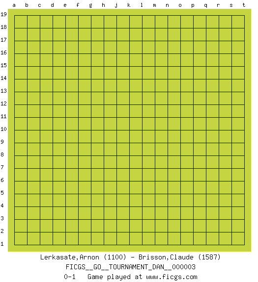 Last move : 0-1 2007 January 23 12:57:19 [Event "FICGS__GO__TOURNAMENT_DAN__000003"] [Site "FICGS"] [Date "2006.12.24"] [Round "1"] [Black "Lerkasate,Arnon"] [White "Brisson,Claude"] [Result "0-1"] [Rating 1 "1100"] [Rating 2 "1587"] 0-1 This go game has been lost on time (started : 2006.12.24 7:56:35) Here are the names of the openings (joseki) played in the four corners : Player White won this Go (weiqi, baduk) game. Follow this game move after move (download)Josekis are not fixed, definitive things. They indicate the moments when everything can change. (Pierre Audouard) The only thing that overcomes hard luck is hard work. (Harry Golden)