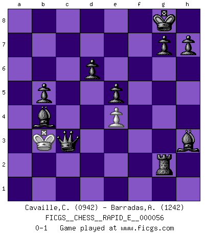 Last move : 0-1 2011 July 3 22:38:23 [Event "FICGS__CHESS__RAPID_E__000056"] [Site "FICGS"] [Date "2011.05.31"] [Round "1"] [White "Cavaille,Cedric"] [Black "Barradas,Anderson"] [Result "0-1"] [WhiteElo "0942"] [BlackElo "1242"] 1.e4 e5 2.Nf3 Nc6 3.Bc4 Bc5 4.Ng5 Qxg5 5.Qf3 Nf6 6.Qg3 Qxg3 7.fxg3 Nd4 8.d3 Nxc2+ 9.Ke2 Nxa1 10.Kd2 a6 11.Nc3 c6 12.b3 O-O 13.Bb2 b5 14.Bxf7+ Rxf7 15.Rxa1 Ng4 16.Re1 Rf2+ 17.Re2 Be3+ 18.Ke1 d6 19.Rxf2 Nxf2 20.Nd1 Nxd3+ 21.Ke2 Nxb2 22.Nxb2 Bd4 23.Nd3 Bg4+ 24.Kd2 c5 25.a3 Rf8 26.h3 Be6 27.b4 c4 28.Ne1 Rf2+ 29.Kd1 Bc3 30.Kc1 Bxe1 31.Kd1 Bc3 32.g4 Rxg2 33.a4 Bxb4 34.axb5 axb5 35.g5 Bxh3 36.g6 Rxg6 37.Kc2 Rg2+ 38.Kb1 c3 39.Ka1 c2 40.Ka2 c1Q 41.Kb3 Qc3+ 0-1 Giuoco Piano Kingside Castling by player Black (move 12) Promotion Queen by player Black (move 40) Player Black won this chess game. Follow this game move after move (download)The stomach is an essential part of the Chess master. (Bent Larsen) Ich könnte leicht behaupten: Ja,ja, Leonid Breschnew wollte nicht, daß ich Weltmeister werde. In der Tat war die Sache komplizierter. (Viktor Kortschnoi) ¿Porque tengo que perder ante este idiota?. (Aron Nimzovich) C'est une question de caractère, Beaucoup de gens perdent leur motivation très vite. D'autres, ils sont rares, peuvent la conserver très longtemps. J'aime les échecs, encore aujourd'hui je suis heureux d'analyser des parties. J'aime toujours gagner, je déteste encore perdre. Bien jouer est important pour mon intégrité intellectuelle et morale. Et puis les échecs vivent en ce moment une période historique grâce à Internet. Ils se développent dans les systèmes éducatifs à travers le monde. Ils sortent de leur ghetto, et c'est mon rôle de mener à bien cette révolution. (Gary Kasparov) Lamb in skin of tiger, still fears the wolf. (Chinese proverb)