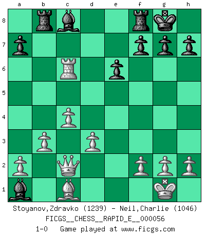 Last move : 1-0 2011 July 4 13:21:49 [Event "FICGS__CHESS__RAPID_E__000056"] [Site "FICGS"] [Date "2011.05.31"] [Round "1"] [White "Stoyanov,Zdravko"] [Black "Neil,Charlie"] [Result "1-0"] [WhiteElo "1239"] [BlackElo "1046"] 1.e4 c5 2.Nf3 Nc6 3.Bb5 e6 4.Bxc6 bxc6 5.d3 d5 6.Ne5 Qc7 7.Nf3 Ne7 8.O-O Ng6 9.Re1 Be7 10.e5 O-O 11.c3 Rb8 12.Nbd2 Ba6 13.c4 d4 14.b3 Bc8 15.Ne4 Nxe5 16.Nxe5 Qxe5 17.Nc3 dxc3 18.Rxe5 Bf6 19.Rxc5 c2 20.Qxc2 Bxa1 21.Rxc6 1-0 Sicilian : Nimzovich-Rossolimo attack (without ...d6) Kingside Castling by player White (move 8) Kingside Castling by player Black (move 10) Player White won this chess game. Follow this game move after move (download)Whoever sees no other aim in the game than that of giving checkmate to one's opponent will never become a good Chess player. (Euwe) Ein Springer auf f6 gegen die eigene Rochadestellung ist schlimmer als ein rostiger Nagel im Knie. (Efim Bogoljubov) El juego de Fischer siempre fue nítido, racional y brillante. Uno de los mejores por siempre. (Dave Regis) Le moment que je préfère le plus dans une rencontre, c'est celui où je sens que la personnalité de l'adversaire se brise. (Robert Fischer) Programming can only do so much before it becomes too much. (Don Groves)