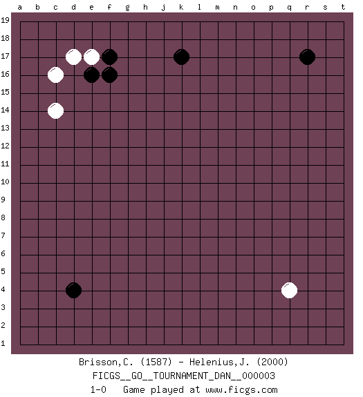 Last move : 1-0 2007 February 13 4:12:10 [Event "FICGS__GO__TOURNAMENT_DAN__000003"] [Site "FICGS"] [Date "2006.12.24"] [Round "1"] [Black "Brisson,Claude"] [White "Helenius,Jan-Krister"] [Result "1-0"] [Rating 1 "1587"] [Rating 2 "2000"] 1.d4 q4 2.r17 c16 3.e16 e17 4.f17 d17 5.f16 c14 6.k17 1-0 This go game has been lost on time (started : 2006.12.24 7:56:35) Here are the names of the openings (joseki) played in the four corners : Corner d16 : c16 e16 Komoku (Somok, Xiao~mu`) 3-4 Point. The komoku (3-4) point is the traditional corner enclosure move.. Ikken Takagakari (Hankan Nop'dakeolch'im, Yi Gaogua`jiao~, 1-Space High Approach). The 5-4 approach move has become more popular in modern times, as modern Go emphasizes speed and influence. Player Black won this Go (weiqi, baduk) game. Follow this game move after move (download)Go is essentially a form of harmony. Go in the 21st century will have to be go of the 'harmony of the six points - the four quarters, the above and the below.' As in life we will need to view the whole rather than the part. Japanese go has focused too heavily on the local (joseki) rather than the whole for 300 years. The reason the Chinese and Koreans are overtaking the Japanese is that they are closer to achieve this whole-board view. (Go Seigen, 9p, 1994) I don't know, I don't care, and it doesn't make any difference. (Albert Einstein)