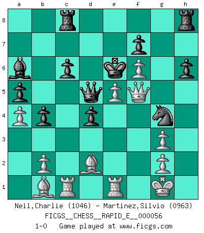 Last move : 1-0 2011 August 18 1:33:25 [Event "FICGS__CHESS__RAPID_E__000056"] [Site "FICGS"] [Date "2011.05.31"] [Round "1"] [White "Neil,Charlie"] [Black "Martinez,Silvio"] [Result "1-0"] [WhiteElo "1046"] [BlackElo "0963"] 1.d4 d5 2.c4 dxc4 3.Nc3 Nf6 4.e3 e6 5.Bxc4 Nc6 6.Nf3 Be7 7.O-O O-O 8.Bd2 a6 9.Re1 Re8 10.a3 b5 11.Ba2 h6 12.a4 b4 13.Ne2 a5 14.Ng3 Ba6 15.Rc1 Qd7 16.Qc2 Bd6 17.e4 e5 18.d5 Nd4 19.Nxd4 exd4 20.Bb1 Bxg3 21.hxg3 Rac8 22.f4 Ng4 23.e5 Qxd5 24.Qh7+ Kf8 25.Qh8+ Ke7 26.Qxg7 Rg8 27.Qh7 c6 28.f5 Rh8 29.f6+ Ke6 30.Qf5+ 1-0 Queen's gambit accepted Kingside Castling by player White (move 7) Kingside Castling by player Black (move 7) Player White won this chess game. Follow this game move after move (download)The Pin is mightier than the sword. (Fred Reinfeld) Auf Remis zu spielen ist gewissermaßen ein Verbrechen gegen das Schachspiel. (Mikhail Nekhemyevich Tal) La caracteristica mas importante en la posición del Ajedrez es la actividad de las piezas. Esto es absolutamente fundamental en todas las fases del juego: Apertura, Juego Medio y especialmente Finales. La limitación primordial en la actividad de una pieza, es la estructuración de los Peones. (Michael Stean) Il n'y a pas de prix trop élevé au scalp de l'ennemi. (Koblentz) Art is not a thing, it is a way. (Elbert Hubbard)