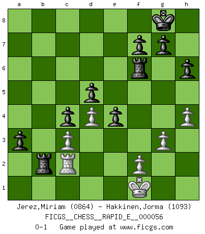 Last move : 0-1 2011 September 3 2:29:9 [Event "FICGS__CHESS__RAPID_E__000056"] [Site "FICGS"] [Date "2011.05.31"] [Round "1"] [White "Jerez,Miriam"] [Black "Hakkinen,Jorma"] [Result "0-1"] [WhiteElo "0864"] [BlackElo "1093"] 1.e4 e5 2.Nf3 Nc6 3.Nc3 Nf6 4.Bc4 Bb4 5.O-O O-O 6.d3 d6 7.Bd2 Bg4 8.h3 Bxf3 9.Qxf3 Nd4 10.Qg3 Nh5 11.Qg4 Nf6 12.Qg5 Bxc3 13.bxc3 Nxc2 14.Rab1 b6 15.Qg3 Re8 16.Rb2 Na3 17.d4 Nxc4 18.Rc2 Nxd2 19.Rxd2 Nxe4 20.Qe3 Nxd2 21.Qxd2 e4 22.Re1 d5 23.a3 Re6 24.Re3 c5 25.Rg3 c4 26.Qf4 Qf6 27.Qxf6 Rxf6 28.a4 a5 29.h4 h6 30.Re3 Rb8 31.g3 b5 32.axb5 Rxb5 33.Kg2 a4 34.Re2 Rb3 35.Rc2 a3 36.Kf1 Rb2 0-1 Four knights : Italian variation Kingside Castling by player White (move 5) Kingside Castling by player Black (move 5) Player Black won this chess game. Follow this game move after move (download)Bobby Fischer is the greatest Chess genius of all time ! (Alexander Kotov) Charakterschwächen offenbaren sich normalerweise während einer Schachpartie. (Garry Kasparov) Las combinaciones han sido siempre el aspecto más intrigante del Ajedrez. Los Maestros las buscan, el público las aplauden, los críticos las alaban. La razón se debe a que las combinaciones hacen posible que el Ajedrez sea más que un ejercicio matemático con una carencia de vida. Ellas son la poesía del juego, son del Ajedrez lo que la melodía es de la música. Ellas representan el triunfo de la mente sobre la materia. (Reuben Fine) Ce qui caractérise les parties de combat, c'est que si le défenseur a constamment de difficiles problèmes à résoudre, l'attaquant doit chercher sans relâche de nouvelles possibilités d'attaque. (Koblentz) Lottery : A tax on people who are bad at math. (Author unknown)